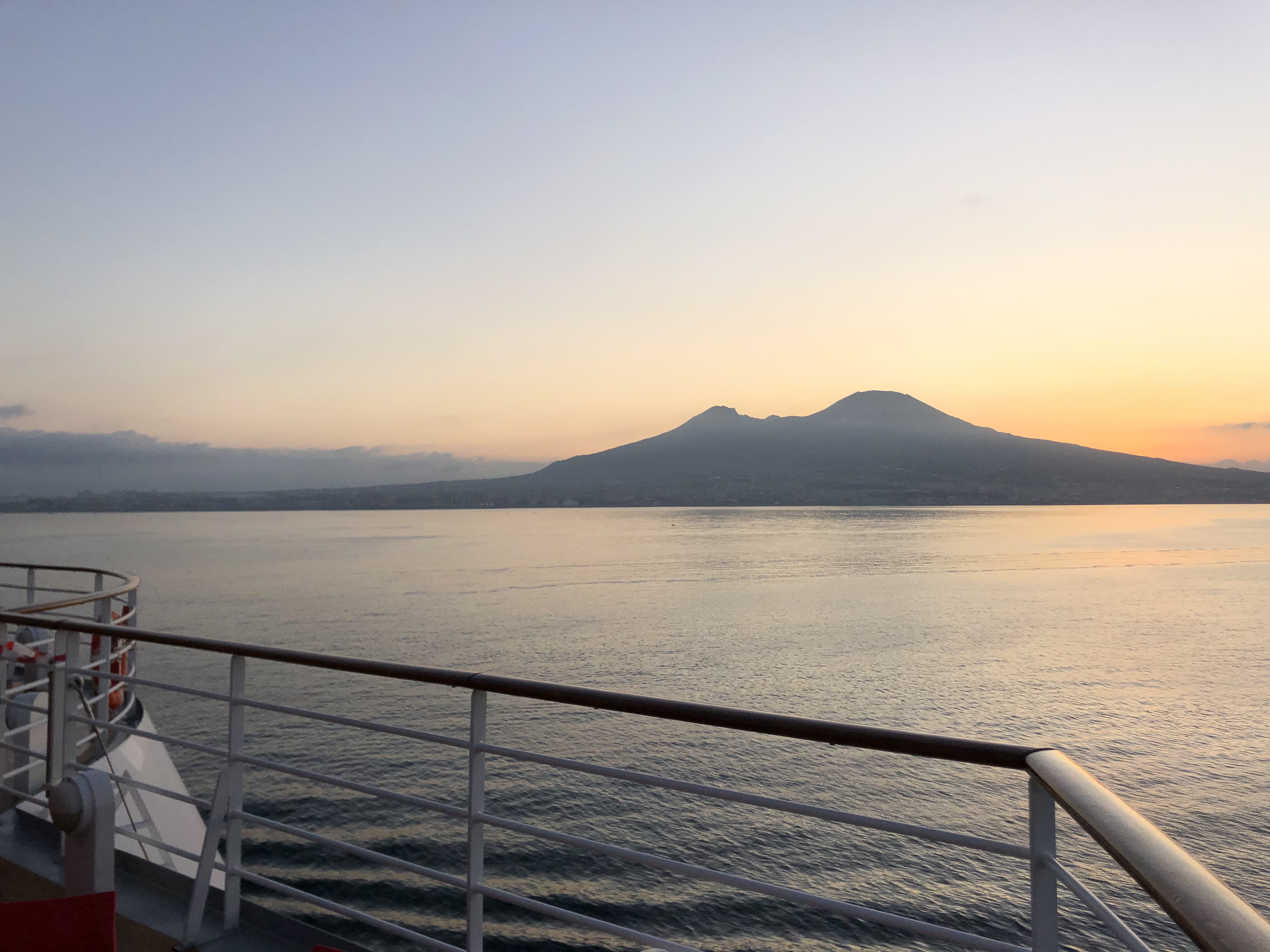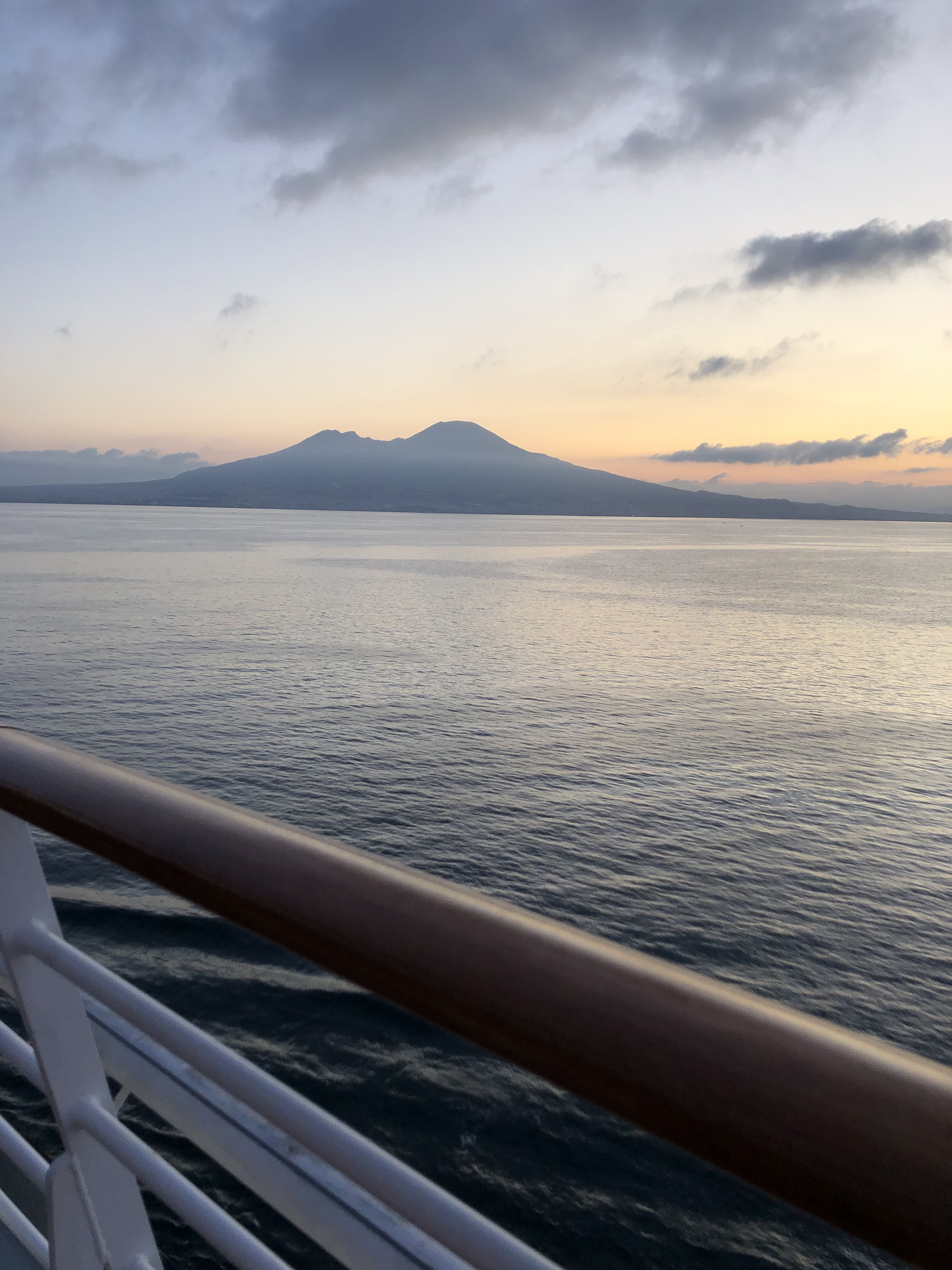 Der Vater meiner Freundin hat sich mittlerweile auch der Fraktion der Frühaufsteher angeschlossen und so können wir bei einem heißen Kaffee, der gerne zwei drei Löffel mehr Kaffeepulver sehen dürfte, auf der Steuerbordseite einen ersten Blick auf den Vesuv erhaschen. Auch wenn wir den Tag über wieder gutes, warmes und sonniges Wetter haben werden, soll es der einzige Moment sein, an dem der Krater des Vesuv heute nicht wolkenverhangen ist.