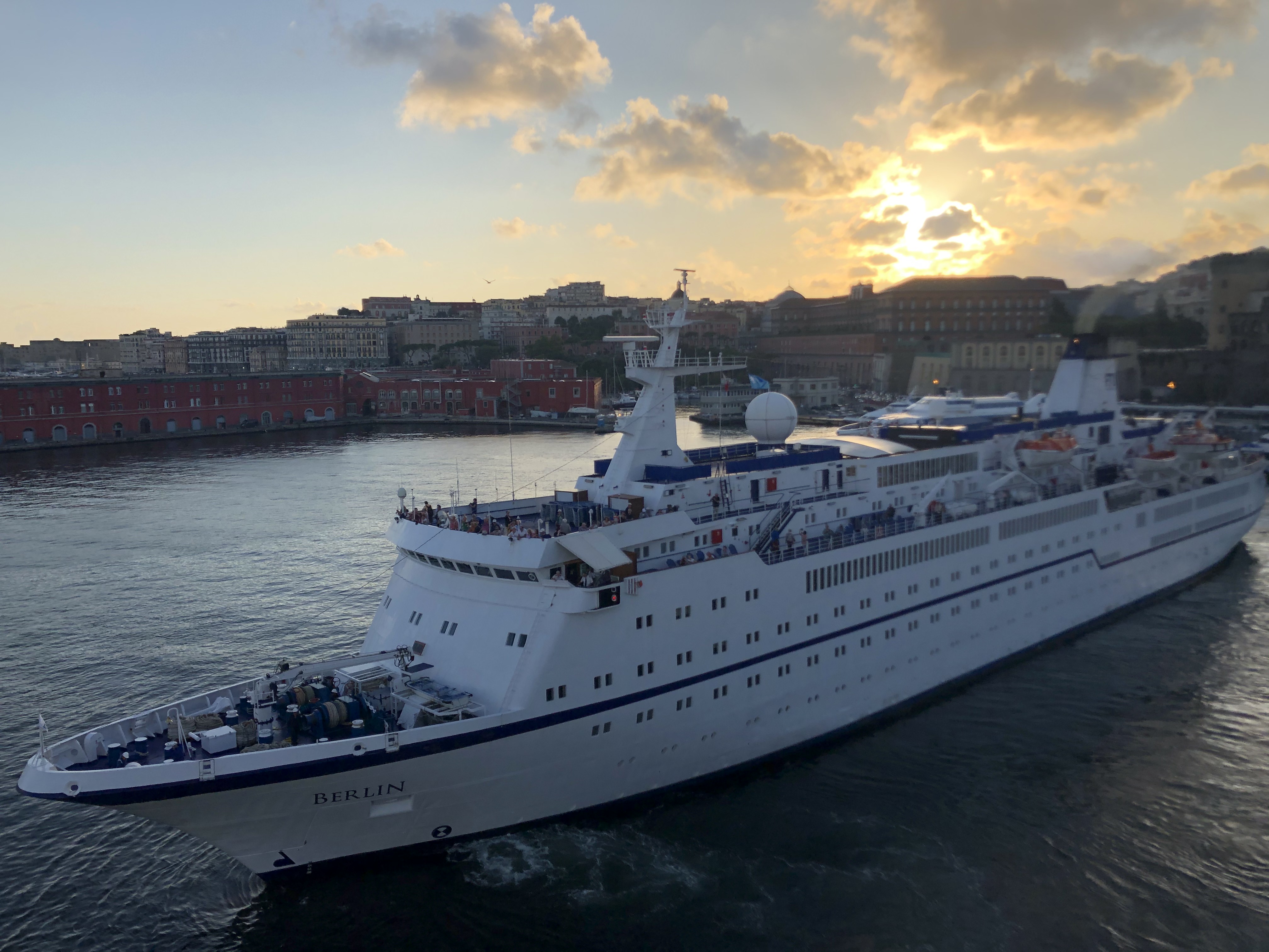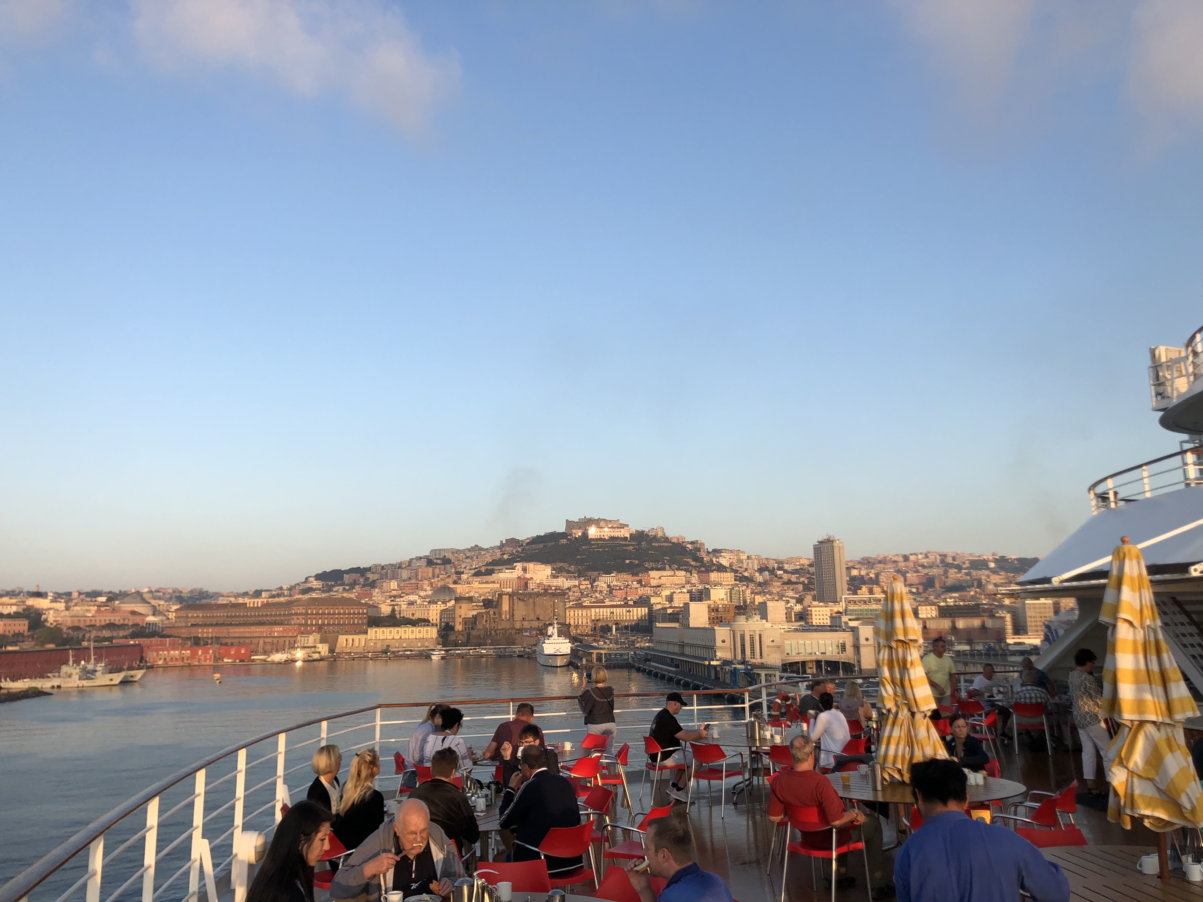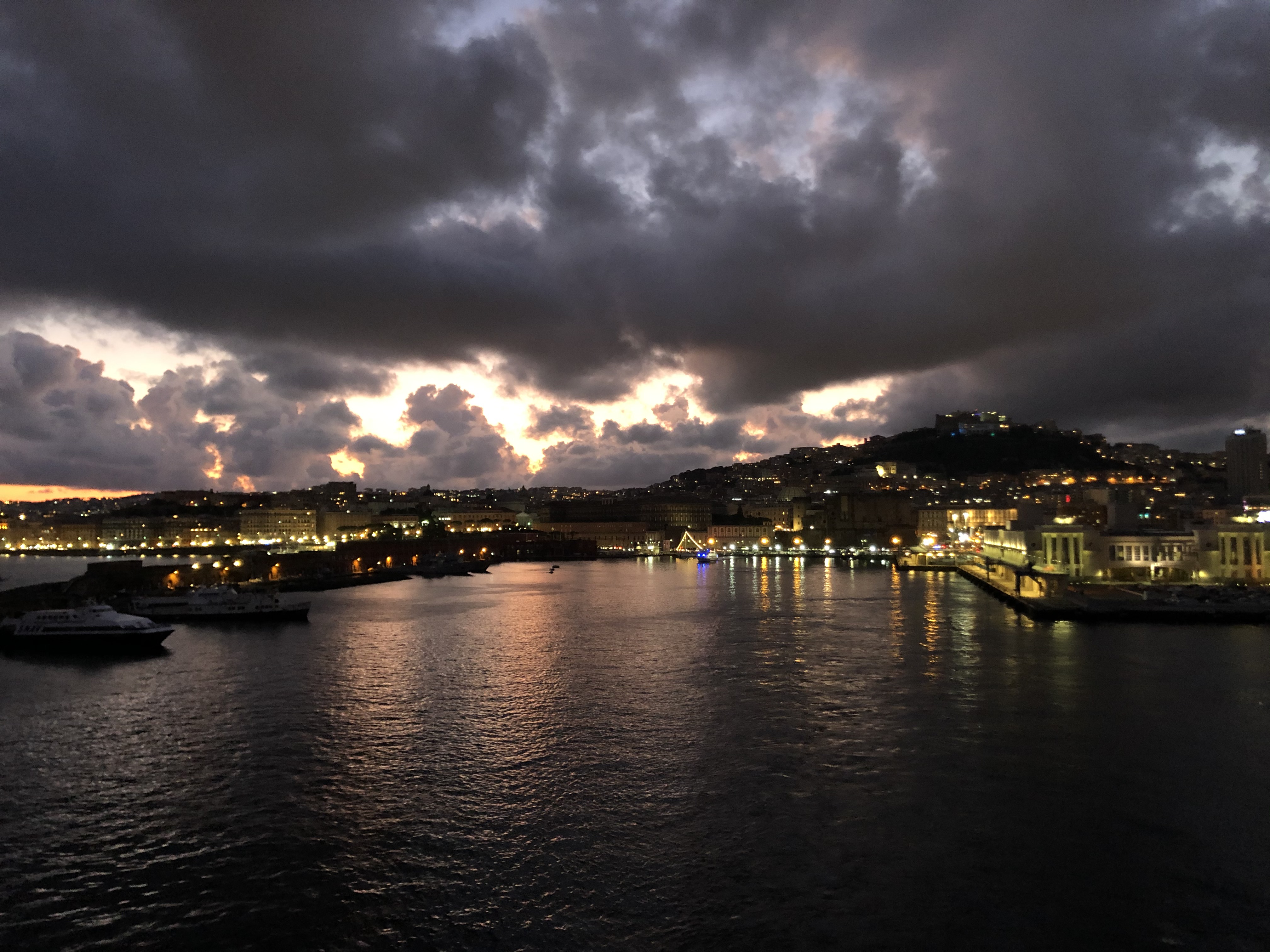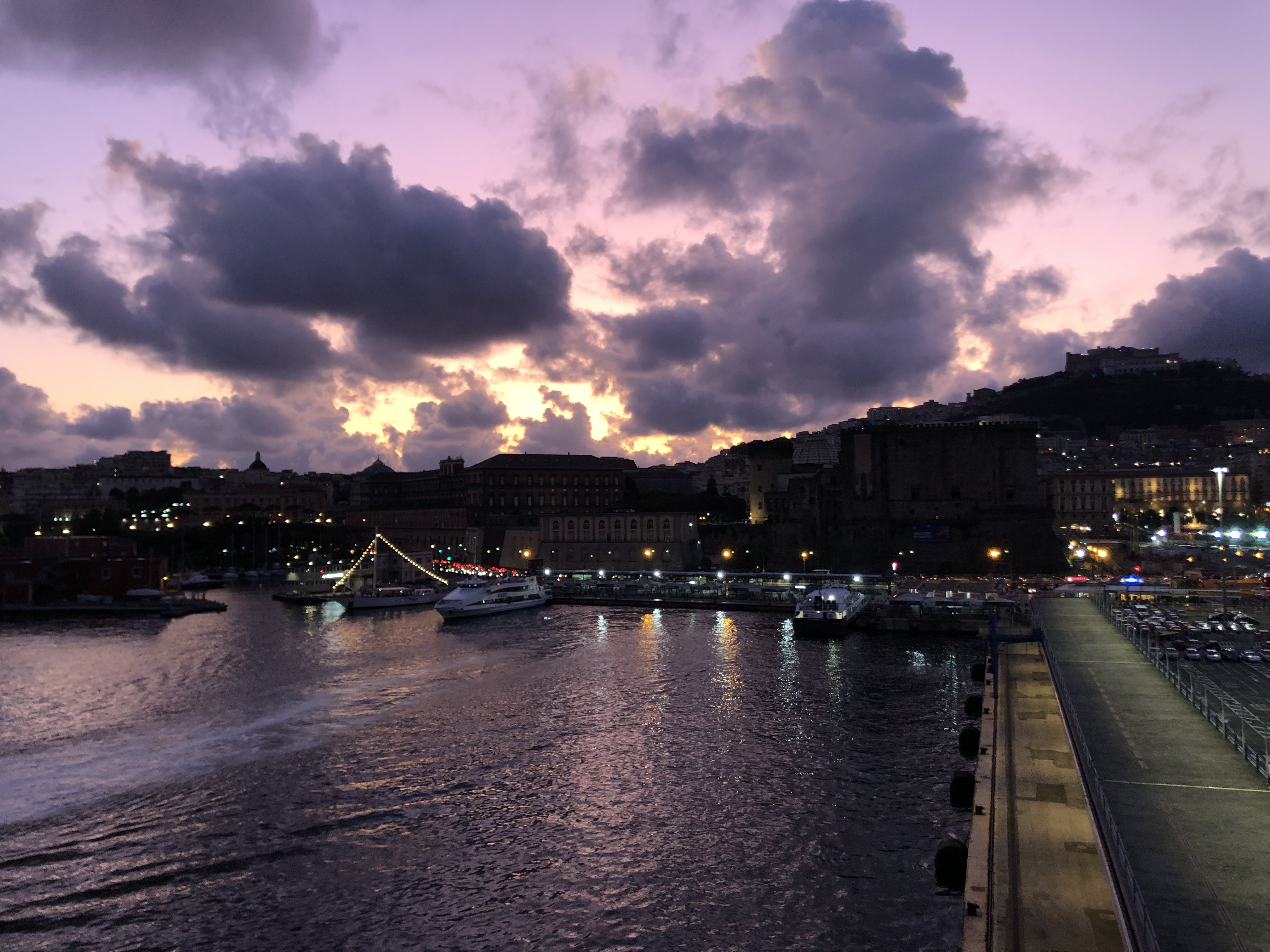 Pünktlich um 19:00 Uhr lässt Kapitän Ziegler die Leinen lösen und wir machen uns auf den Weg nach Civitavecchia. Von der Terrasse aus haben wir während des Abendessens einen tollen letzten Blick auf Neapel!