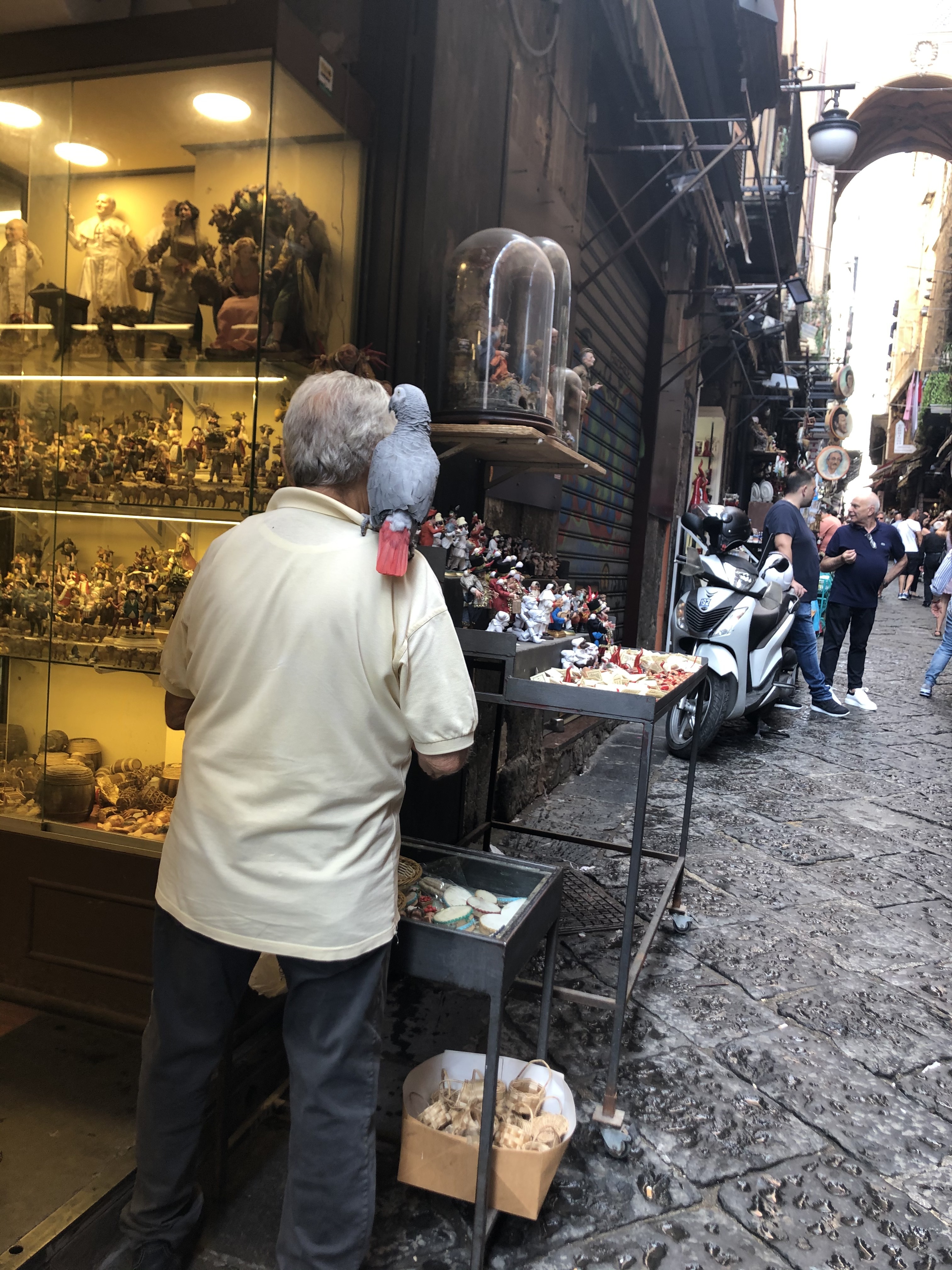 Unser nächstes Ziel ist die Via San Gregorio Armeno, auch bekannt als „Krippengasse“. Dort haben die weltberühmten neapolitanischen Krippenbauer Ihren Sitz, und neben klassischen kirchlichen Darstellungen findet man beeindruckend in Handarbeit hergestellte Landschaftsszenerien und Abbildungen berühmter Persönlichkeiten, von Angela Merkel bis zu Bastian Schweinsteiger. Am faszinierendsten war jedoch einer der Krippenbauer, der mit einem kleinen Pinsel und großer Sorgfalt seine ausgestellten Figuren abstaubte während sein Papagei völlig unbeeindruckt vom Treiben drumherum ohne Fußbändchen oder ähnlichem auf seiner Schulter saß und den älteren Herren begleitete... ![]()