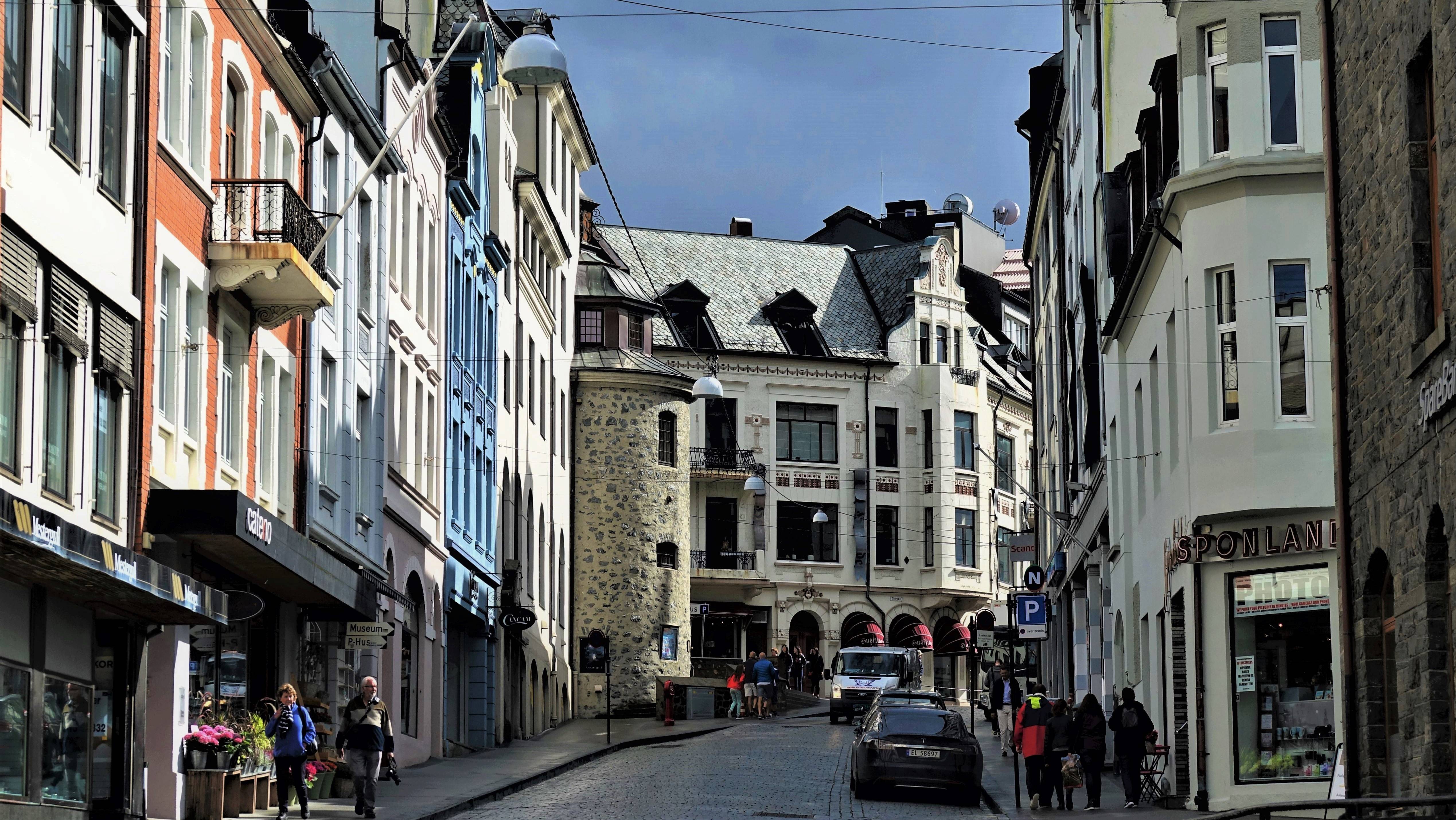 Während des Frühstücks ziehen dann ein paar Wolken auf, aber es sieht alles noch trocken aus, so dass wir, nur mit unseren Softshell Jacken bekleidet, uns auf unseren Stadtsparziergang begeben. Da wir uns die 418 Stufen auf den Hausberg „Aksla“ dieses Jahr nicht antun wollen, machen wir uns auf den Weg auf den „store Haugen“, dem alternativen Aussichtspunkt auf die schöne Jugendstilstadt.