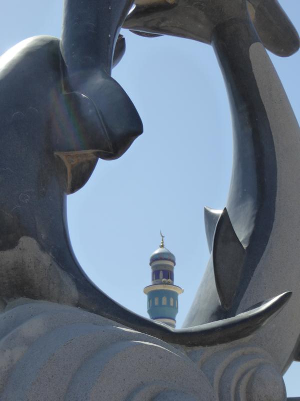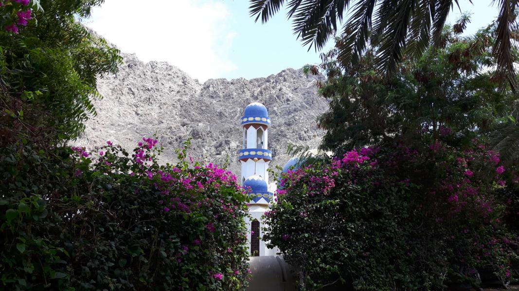 Auf der Straße sind auf einmal viele Männer unterwegs und alle strömen in die gleiche Richtung. Aus der nahegelegen Moschee schallen aus den Lautsprechern die Worte des Vorbeters zu uns rüber. Verstehen tun wir gar nichts, aber es scheint so, als er würde zum Gebet rufen. Unterhalb des Forts liegt die Al Khor Moschee mit den leuchtend blauen Kuppeln. Ein Tip für Männer: wenn „Mann" eine Toilette sucht, im Vorhof hinten rechts kann man eine finden. Das hat uns ein freundlicher Omani verraten. Ich darf den Hof nicht betreten, weil ich nicht so gekleidet bin, wie es vorgeschrieben ist: Hose nicht knöchellang und Blusenärmel zu kurz und kein Kopftuch.