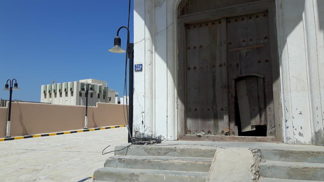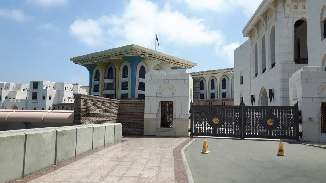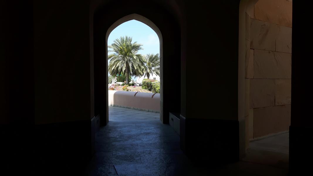 An einer Polizeistation, nicht weit vom Museum, fragen wir nach dem Weg zum Sultanspalast. Der Polizist zeigt gerade aus und dann links. Zwischen den Palmen sehen wir das Al Mirani Fort mit den schönen weißen abgerundeten Zinnen. Es ist zu heiß, um hochzusteigen. Zumal wir gar nicht wissen, ob es für die Allgemeinheit geöffnet ist. Man hätte bestimmt eine schöne Aussicht von dort oben.