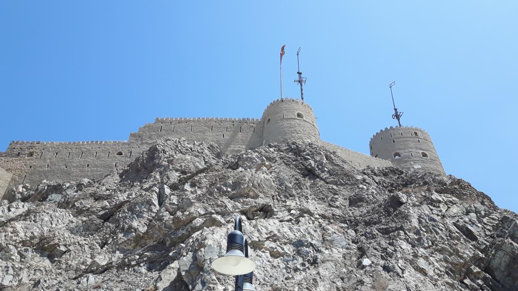 Hinter dem kleinen Museum of Modern Art, das wir im letzten Winter besucht haben, biegen wir rechts ab und laufen ein Stück den Berg hoch. Hier sind keine Touristen anzutreffen. Gibt es was zu sehen? Ja, das im Jahr 1580 von den Portugiesen erbaute Fort Muttrah.
