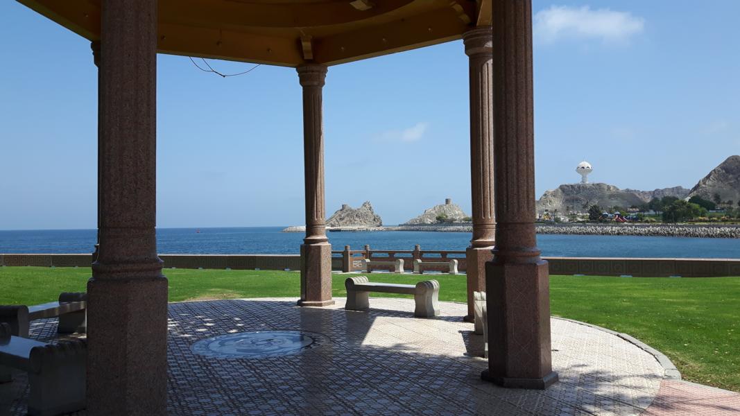 Kurze Rast im Riyam-Park. Hier war voriges Jahr übrigens das Ziel des Radrennens „Tour of Oman“. War schön, das miterlebt zu haben, wie die Radfahrer über die Ziellinie fuhren und über uns ein Helikopter seine Runden flog. Zwischen den riesigen Betonblöcken der Uferbefestigung sind heute jede Menge Krebse zu sehen. Sie krabbeln in den Zwischenräumen herum und einige haben es sogar fast ganz nach oben geschafft. Über uns strahlt die riesige Weihrauchschale, das Wahrzeichens Muscats in der Sonne.