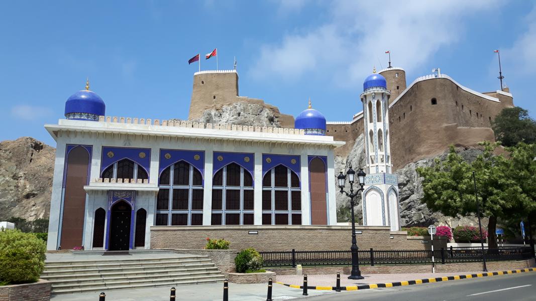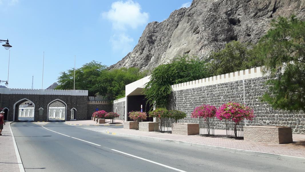 Vor uns liegt eine schöne Straßenüberführung. Lesen können wir das hier nicht, haben jedoch heraus gefunden, dass es das Muscat Gate Museum ist. Es wurde erst im Jahr 2001 eröffnet und sollten wir nochmal hierher kommen, werden wir auf jeden Fall reinschauen.