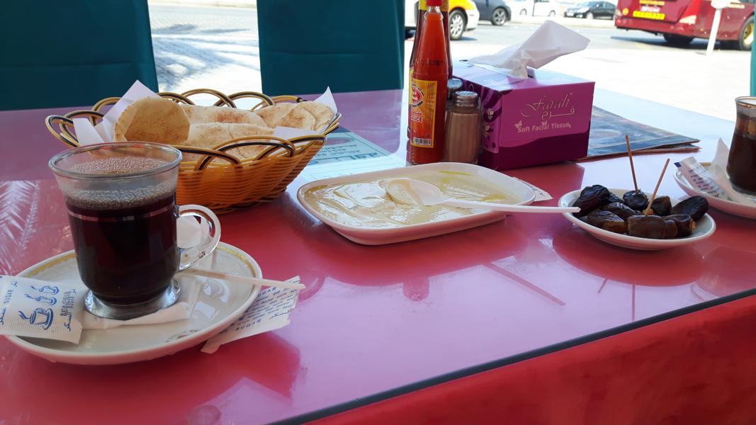 Na, jetzt erst mal was trinken und eine Kleinigkeit essen. Kichererbsen Humus und ein Fladenbrot – das reicht und dann einen leckeren Kaffee hinterher mit ein paar Datteln und wir können den restlichen Weg zurück zum Hafen antreten.