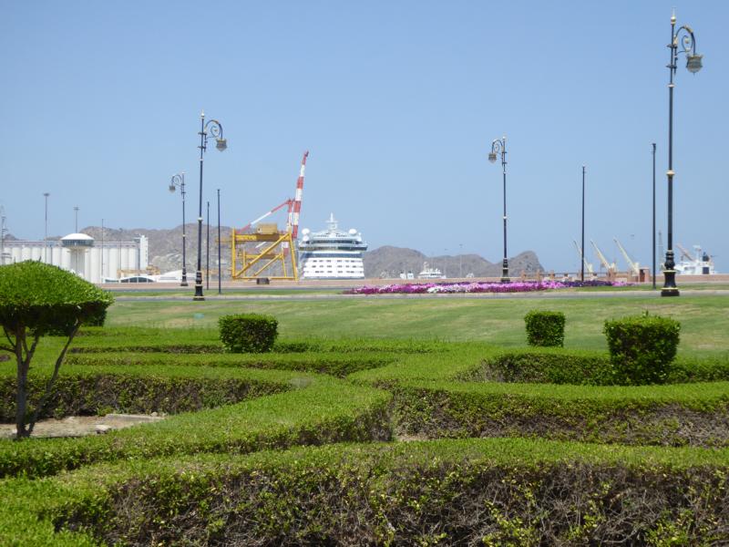 Durch den Hinterausgang oder ist es der Eingang? - keine Ahnung, gelange ich auf einen anderen Pier. Da liegt der großer Dreimaster der Royal Navy of Oman und weiter hinten sehe ich, hat die Jacht des Sultans festgemacht. Vielleicht ist er ja gerade in Muscat oder doch in Salalah? Dort hat er ja auch einen Palast. Nach 5 ½ Stunden sind wir wieder an Bord. Wir sind zufrieden mit dem Laufpensum und dem, was wir heute gesehen haben – ein Dusche und dann noch etwas an Deck das schöne Wetter genießen. Den Sonnenuntergang anschauen und dann heißt es Sail away from Muscat.