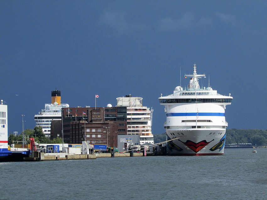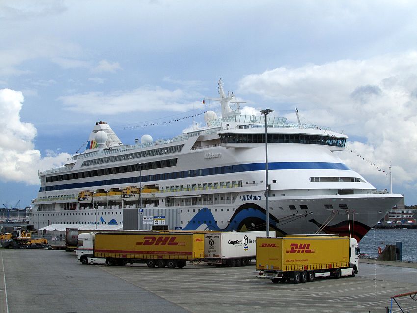 Von meiner Position aus habe ich einen super Blick auf AIDAauras Frontpartie. Es ist kurz vor 12 Uhr, die Gäste der vergangenen Tour werden sicher mittlerweile nahezu alle von Bord und die kleine Aura für den Ansturm neuer erlebnishungriger Reisender bereit sein.