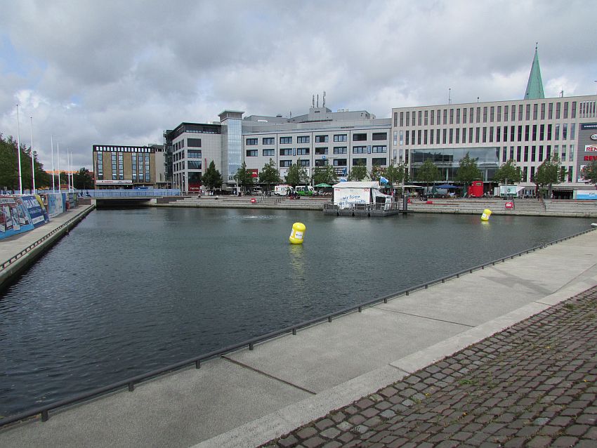 Gleich drei Besonderheiten nennt dieses im Sommer gern für Open Air-Veranstaltungen genutzte Areal sein Eigen. Da sind zum einen die dreieckige Form der Wasserfläche und zum anderen die fehlende Verbindung zum Meer oder zumindest zu einem Wasserarm. Letztlich müsste dieser "Hafen" eigentlich "Keinbootshafen" heißen, denn ich kann keinerlei Wasserfahrzeuge auf der Oberfläche erkennen. Und auch keinen Hafen.