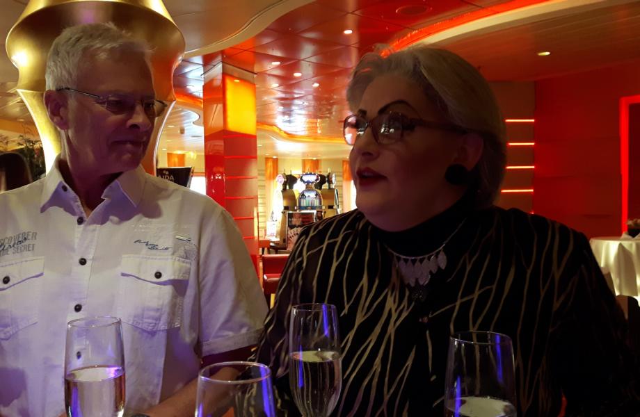 Am Vormittag gehe ich in die Anytime-Bar zum Treffen der Forenmitglieder vom Wasserurlaub. Sehr viele Mitglieder hatten sich angemeldet und es ist recht kuschelig. Diese Treffen sind immer ganz nett, denn meist kennen sich die Forenmitglieder nur virtuell. Sich real zu sehen, die Stimme zu hören, sich in Augenschein zu nehmen und es gibt immer viel zu erzählen bzw. sich auszutauschen. Oft organisiert man gemeinsam irgendwelche Unternehmungen oder man plant spontan noch irgend etwas. Olli, unser Entertainment Manager ist ganz überrascht, wie viele da sind und ist voller Lob über uns. Hat das Forum doch eine Plattform geschaffen, wo AIDAfahrer sich austauschen können und er freut sich immer, wenn von den Mitgliedern Anregungen kommen, was man ändern oder besser machen könnte. Wo er recht hat, hat er recht. Ich bin gerne bei dieser Gruppe als Perlenfee dabei. Dankeschön an Tracy, die dieses Treffen in die Wege geleitet hat und Olli verspricht uns, dass wir am Ende der Reise uns noch einmal treffen werden, um ein Resümee zu ziehen. Klasse Idee finden wir. Mein Mann ist nicht mitgekommen. Er ist im Theatrium, denn dort hält Lektor Axel C. Brüggemann seinen ersten Vortrag auf der Tour bis Mallorca. Wir hatten ihn schon einmal an Bord, als wir die Südamerika-Reise gemacht haben - mit der Umrundung Kap Hoorns. Vergessen haben wir ihn nicht, denn seine Vorträge waren gespickt mit Wissen um Geschichte und Kultur. Er vermittelt in kurzer Zeit sehr viel, mit so viel Leichtigkeit vorgetragen, dass es einem nie und nimmer langweilig wird. Im Mittelpunkt des heutigen Vortrags seht der Oman – Willkommen im Öldorado. Schade, hätte ich auch gerne gehört, aber manchmal muss man sich Prioritäten setzen, auch wenn es nicht so einfach ist. Zum Glück folgen ja noch ein paar Vorträge von ihm und dann gibt es ein Wiedersehen!