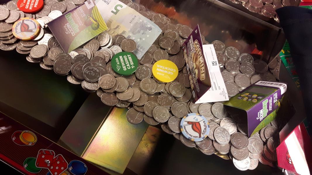 Auf der Bühne des Theaters läuft nach dem Abendessen die Show „Dreams“, wir bleiben ein wenig stehen und schauen zu. Nein, wir sind nicht leichtsinnig geworden – aber einmal wollten wir unser kleines Glück doch herausfordern. Münzen rein, manchmal kamen einige als Gewinn wieder heraus.