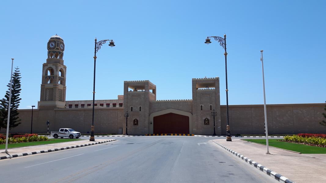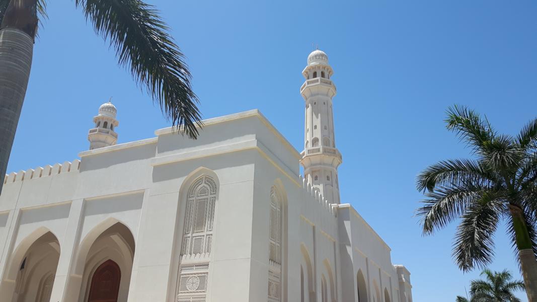 Nächster Halt ist an der Sultan Qaboos Moschee. Die zwei schlanken hohen Minarette sind schon von weitem zu sehen. Reinschauen werden wir nicht, sind nicht „anständig“ angezogen und die Zeit drängt, denn wir haben ja noch einiges vor uns auf dem Ausflug. Vielleicht das nächste Mal, wenn wir wieder mal hierher kommen sollten ... man soll ja nie nie sagen! Der Park ringsherum ist eine kleine Oase - der Rasen leuchtet grün und die langen Wedel der Palmen bewegen sich sanft im Wind.