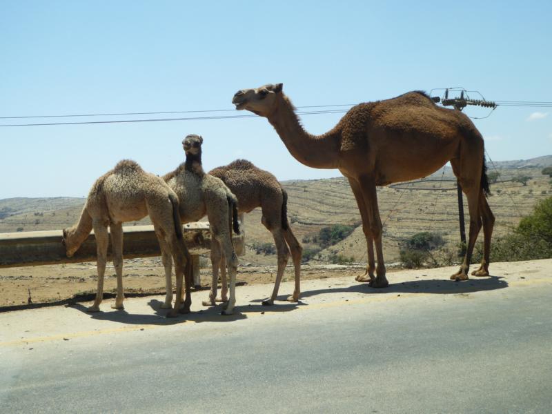 Es geht weiter ins Gebirge. Wir sitzen im Geländewagen schön hoch und haben eine gute Sicht. Zur Mittagszeit hat sich die Luft etwas aufgeklart und der morgendliche Dunst hat sich verzogen. Immer wieder laufen Kamele entlang der Straße oder überqueren sie, ohne auf den Verkehr zu achten. Hahahaaa, die bewegen sich nicht einen Zentimeter von der Stelle und so warten wir geduldig, bis sie unserem Fahrzeug endlich die Weiterfahrt ermöglichen.