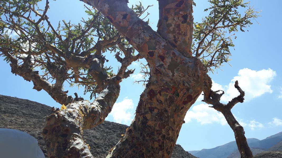 Es geht für uns jetzt noch einmal ein Stück hoch in die Berge. Die Gesteinsschichten erinnern mich an Khasab, wo wir vor ein paar Tagen waren. Es rumpelt ein wenig, als wir über Schotter fahren und zu einem Weihrauchbaum laufen. Die Bäume, die ein stattliches Alter erreichen, sehen etwas unscheinbar aus. Sie haben ein paar Blätter, aber darauf kommt nicht an. Der Stamm ist der Produzent des Weihrauchs. Er wird angeritzt und dann tritt sehr langsam eine milchige Flüssigkeit aus, die sich nach einiger Zeit verhärtet. Dann wird geerntet. Vorsicht ist geboten, wenn man die Milch berührt, zack ist es so, als hätte man Kleber an den Fingern. Man kann Weihrauch auch lutschen, soll gesund sein.