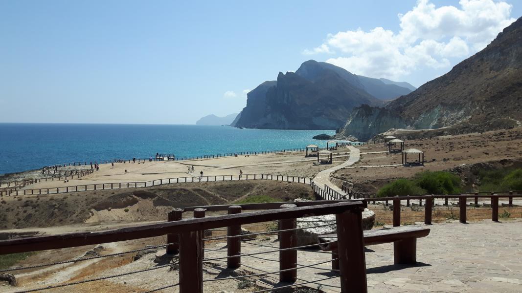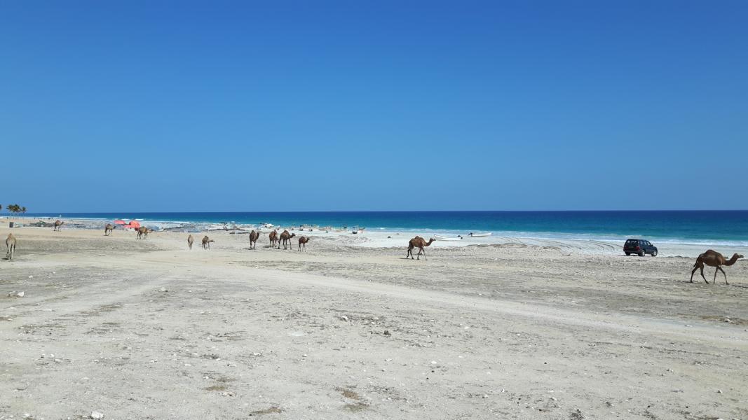 Auf der Straße parallel zur Küste begegnen uns wieder Kamele. Übrigens fressen die Kamele gerne Mangroven, deshalb sind diese eingezäunt. Warum eingezäunt? Die Mangroven wirken nach dem Verzehr bei den Kamelen wie ein Droge und sie sind berauscht. Ob sie deshalb so stur sind???? Kamelfleisch ist sehr begehrt hier im Oman, es schmeckt nicht schlecht – habe es einmal probiert (2015) Es hängt in langen dünnen Streifen über Stangen an den Verkaufsständen, wenn man es frisch kaufen möchte. Die Reise werde ich nie vergessen. Es ging von Cohin bis Antalya damals und gleich am zweiten Tag der Reise habe ich mir die Achillessehne abgerissen und bin mit dem abgefatztem Teil die restlichen 20 Tage herum gehumpelt. Ich hatte gedacht, es sei eine Verstauchung. Zuhause angekommen ging ich 2 Tage zum Arzt und landete anschließend in der Klinik, wo die Sehne wieder angenäht wurde und ich brav 10 Wochen mit Krücken herumlaufen durfte. Ich habe es überlebt, wie die 20 Tage der Reise auch. Oh, nun bin beim Kamelfleisch wieder in die Vergangenheit abgedriftet. Sorry....