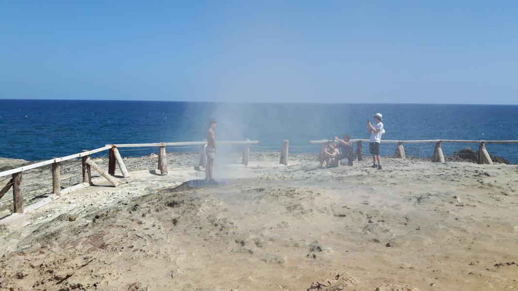 Das erste mal dachte ich, es höre sich an, als würde dort unten ein feuerspeiender Drache eingeschlossen sein. Dann plötzlich zischt es und das Wasser schießt gute 10 Meter wie eine Fontäne empor. Heute stehen ein paar junge Männer dicht an einem Gitter und lauern auf das bekannte Geräusch. Einer von ihnen ist sehr mutig, er hat sich auf das Gitter gestellt und Sekunden später ist er klitschnass und die anderen johlen vor Freude. Klar darf ich sie fotografieren und so warten wir gemeinsam auf die nächste Dusche. Im Restaurant trinken wir noch einen Kaffee und dann geht es zurück zum Hafen. Die Kamele am Strand, bleiben mir immer in Erinnerung. Denn normalerweise bringt man ja Kamele immer mit Sanddünen und Wüste in Verbindung.