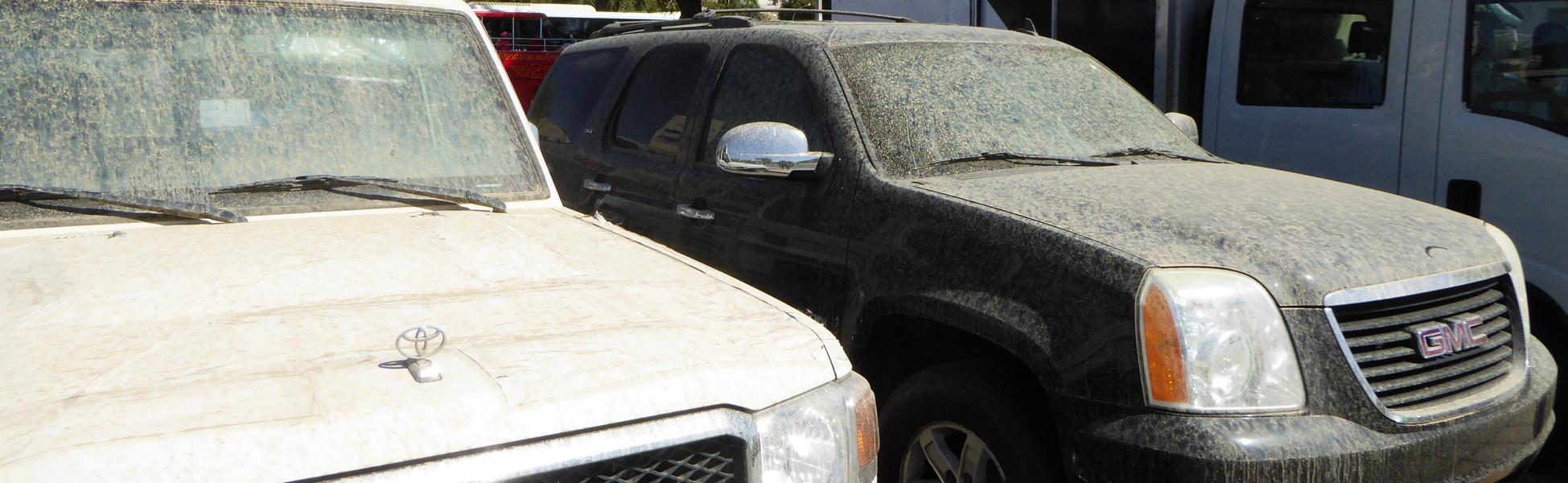 Viele Fahrzeuge sind mit einer feinen Staubschicht überzogen, fast wie bei uns zu Hause, wenn der Blütenstaub alles gelb färbt. Na ja, Saharastaub hatten wir auch schon auf unserem Balkon weggeputzt.