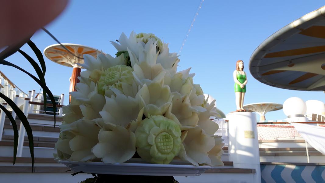 Wieder an Bord, sehen wir, dass auf dem Pooldeck heute Tische weiß eingedeckt sind. „Frühlingsfest“ an Bord der Bella, ein Event, das wir noch nicht kennen.