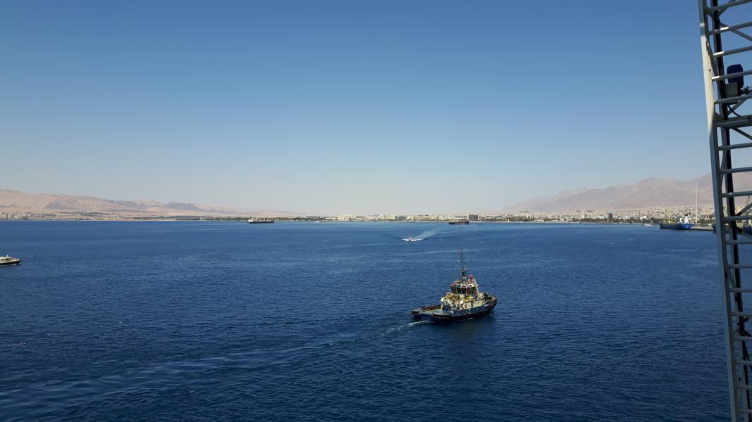 Die Seetage haben wir gut hinter uns gebracht, aber brrrrrrrrrrr, die Temperatur ist deutlich gefallen. Was machen wir jetzt in Aqaba (übersetzt Helena)? Die Bella trifft am Nachmittag ein. Der hohe Fahnenmast ist gut zu erkennen und der Rest verschwindet in leichtem Dunst.