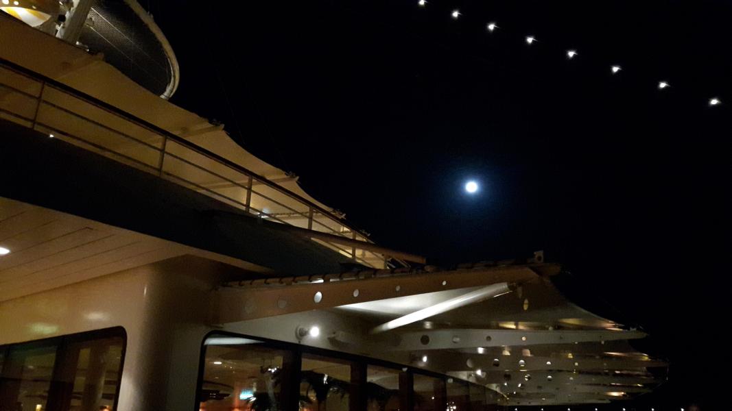 Der Abend endet für uns an der Ocean Bar mit einem Schlummertrunk und den Blick auf die Lichter der Stadt und den fast runden Mond. Gute Nacht, morgen fahren wir zum Wadi Rum.