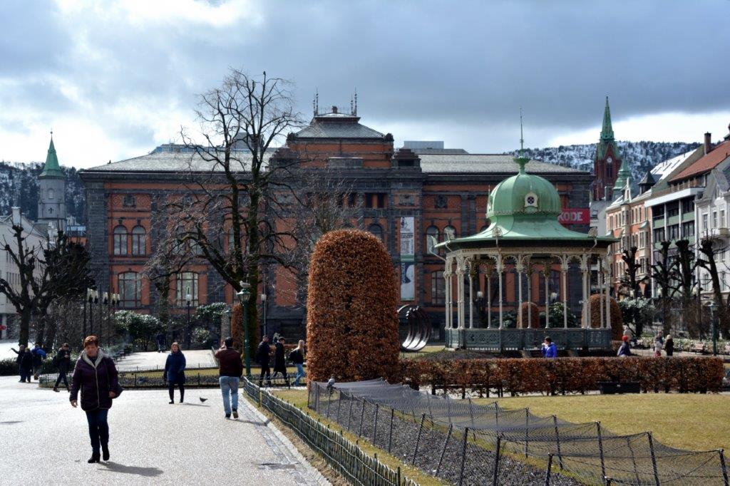 Dann bogen wir in eine der niedlichen, hinab führenden Gassen ab bis wir ein unansehliches Viertel gegenüber in der Nähe des Hurtigruten-Kais erreichten. In einem Supermarkt besorgten wir uns kulinarische Andenken für zu Hause: Brunost und später auch Flatbrød. Als wir den Supermarkt verließen, erwartete uns das echte Bergen: Es begann zu schneien … Kapuze auf und durch! Durch das Schneetreiben Richtung Innenstadt. Wir passierten die Rückseite des ältesten Theaters Norwegens mit festem Standort und die Johanneskirken, stießen auf den Ole Bulls Plass und machten dem berühmten norwegischen Geiger Ole Bull unsere Aufwartung. Leider hatte man den im Sommer plätschernden Wasserfall „abgeschaltet“. Vom Musikpavillon mit dem Westländischen Kunstmuseum im Hintergrund aus