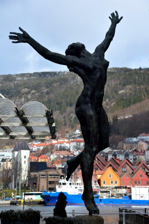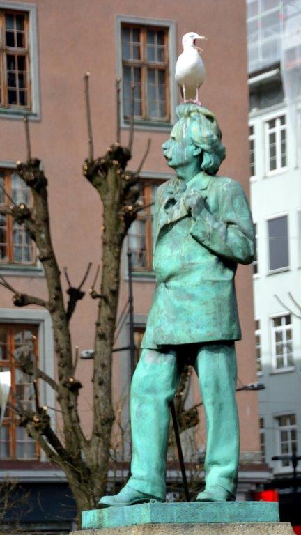 Ludvig Baron Holberg stand locker und trotzdem stocksteif auf seinem Sockel und schaute Richtung Fischmarkt. Holberg war ein dänisch-norwegischer Dichter, der von 1684 bis 1754 lebte. Interessant, wie zwei Nationen Wert legen auf ihren Holberg. Dänemark beharrt auf ihren Ludvig, da seinerzeit Norwegen ein Teil Dänemarks war. Norwegen pocht auf ihren Holberg, da er in Norwegen geboren wurde. Wo? Natürlich in Bergen … Sei es drum – wir wollten nicht darüber diskutieren, ob Däne oder Norweger.