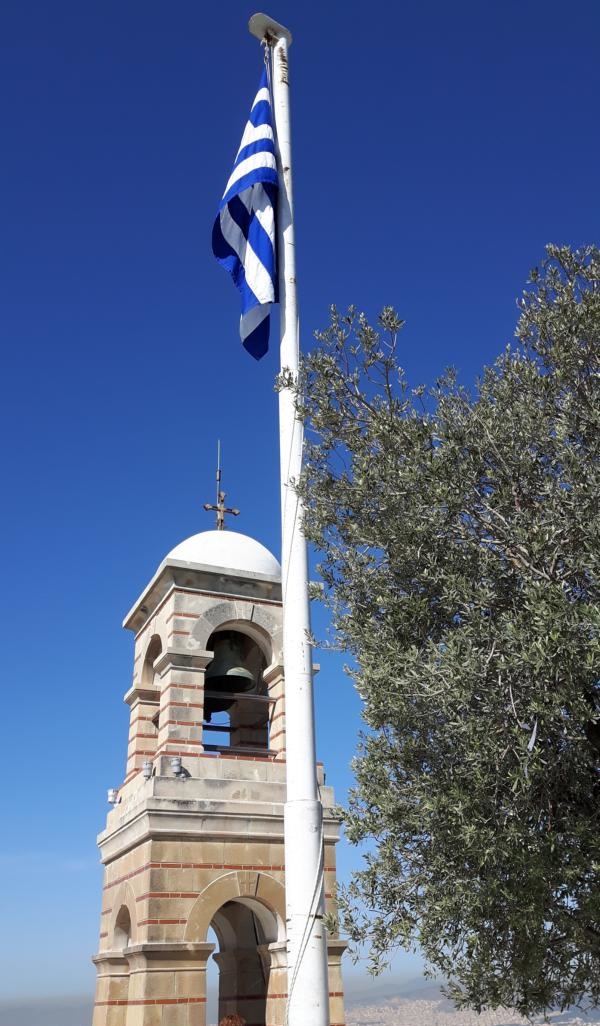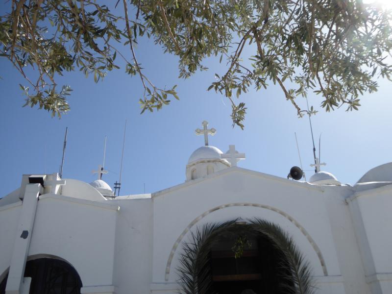 Die Tür der Kirche Agios Georgios ist mit Palmwedeln geschmückt und das Kreuz an dem Turm strahlt weiß in der Sonne.