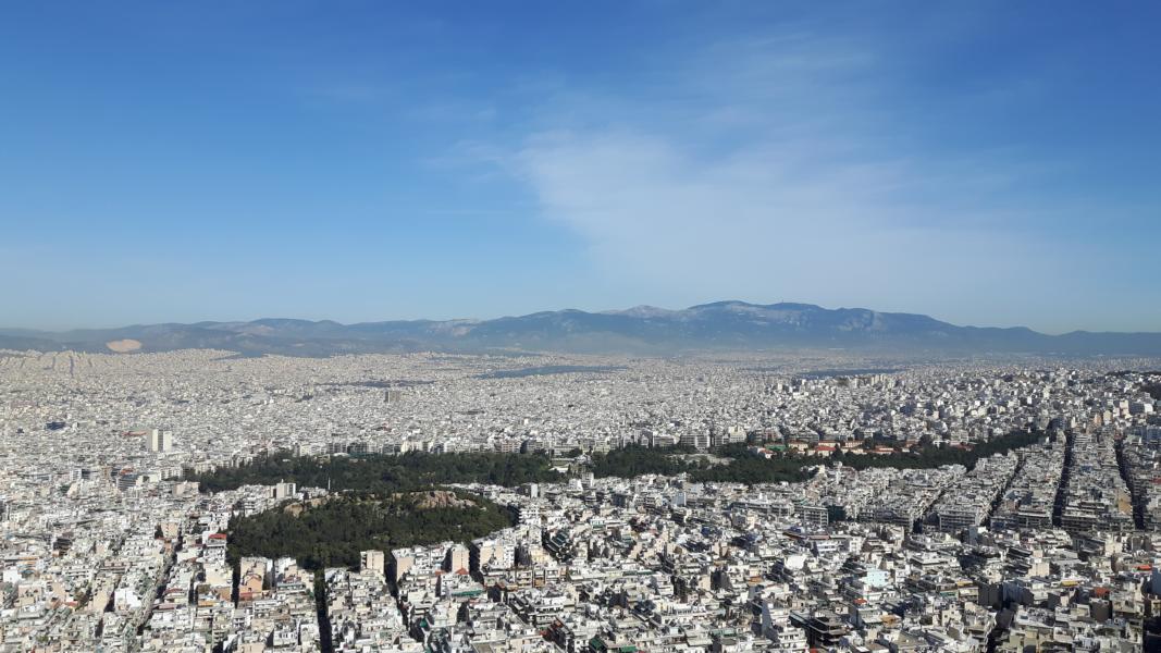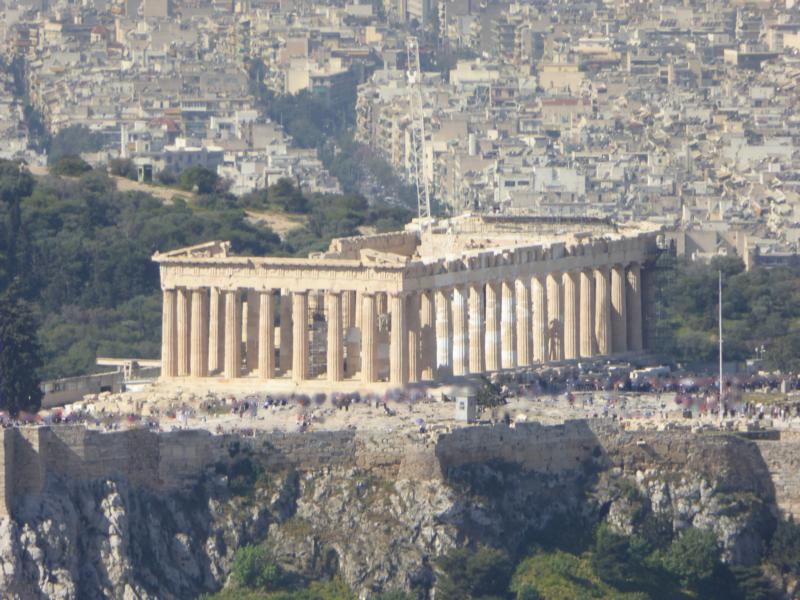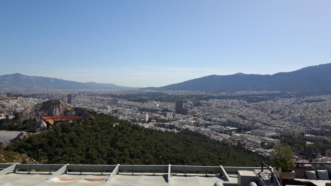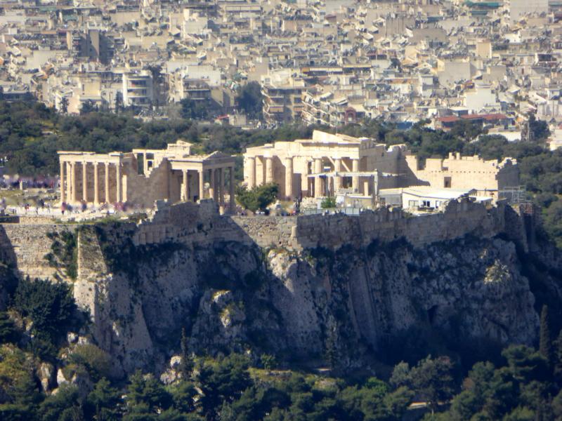 Wir drehen uns um und vor staunen verschlägt es uns die Sprache. Zu unseren Füßen liegt Athen, die Häuser erfüllen die Bucht vor den Bergen wie ein Patschwork-Teppich und mitten drin grüne Inseln, leicht erhoben mit den antiken Stätten.