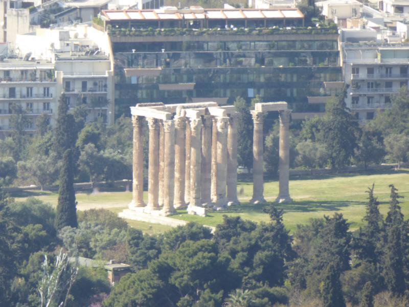 Verwaist stehen 15 korinthische Säulen auf einer Freifläche, es sind die Überreste des Olympieion (Tempel des Olypimpischen Zeus ). Er war mal einer der größten Tempel im antiken Griechenland. Ich sehe schon, hier hat jeder Stein einen historischen Hintergrund. Sogar das riesige Atrium der Athener Academie ist gut zu erkennen.