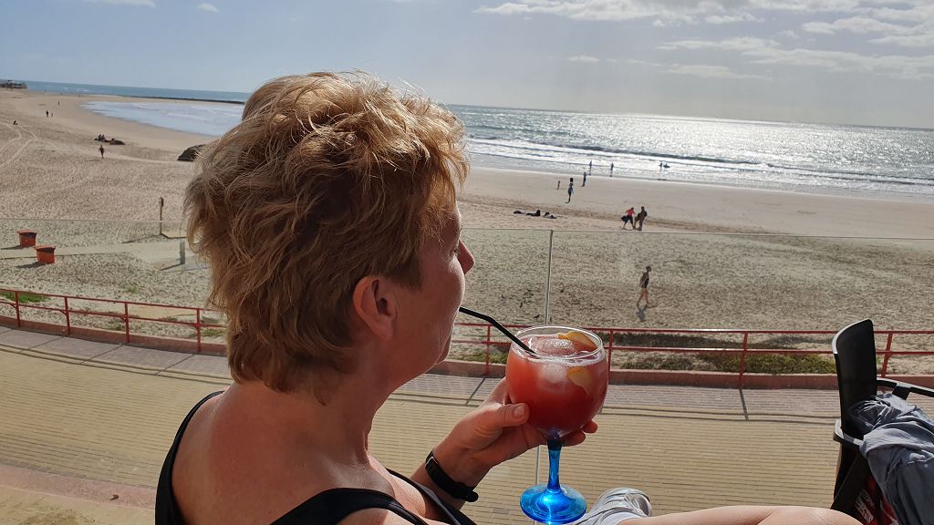 Zum Glück fand sich am Strand aber auch eine kleine Bar und wir bekamen einen Tisch auf der Terrasse und gönnten uns, beim Blick auf Strand und Meer, mal wieder ein Eimerchen Sangria bei strahlendem Sonnenschein.