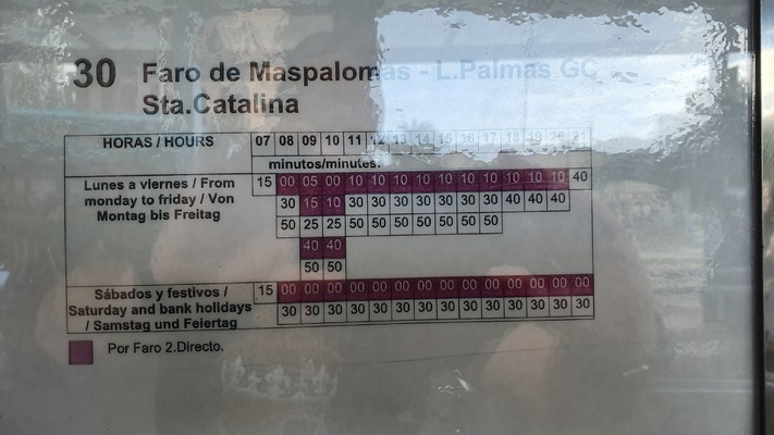 Aber schon der Blick auf den Wetterbericht machte uns Hoffnung. Für den Bereich Maspalomas war Sonnenschein und Temperaturen um 23 Grad gemeldet. Wir verließen also unser schönes Schiff und steuerten den Busbahnhof an.