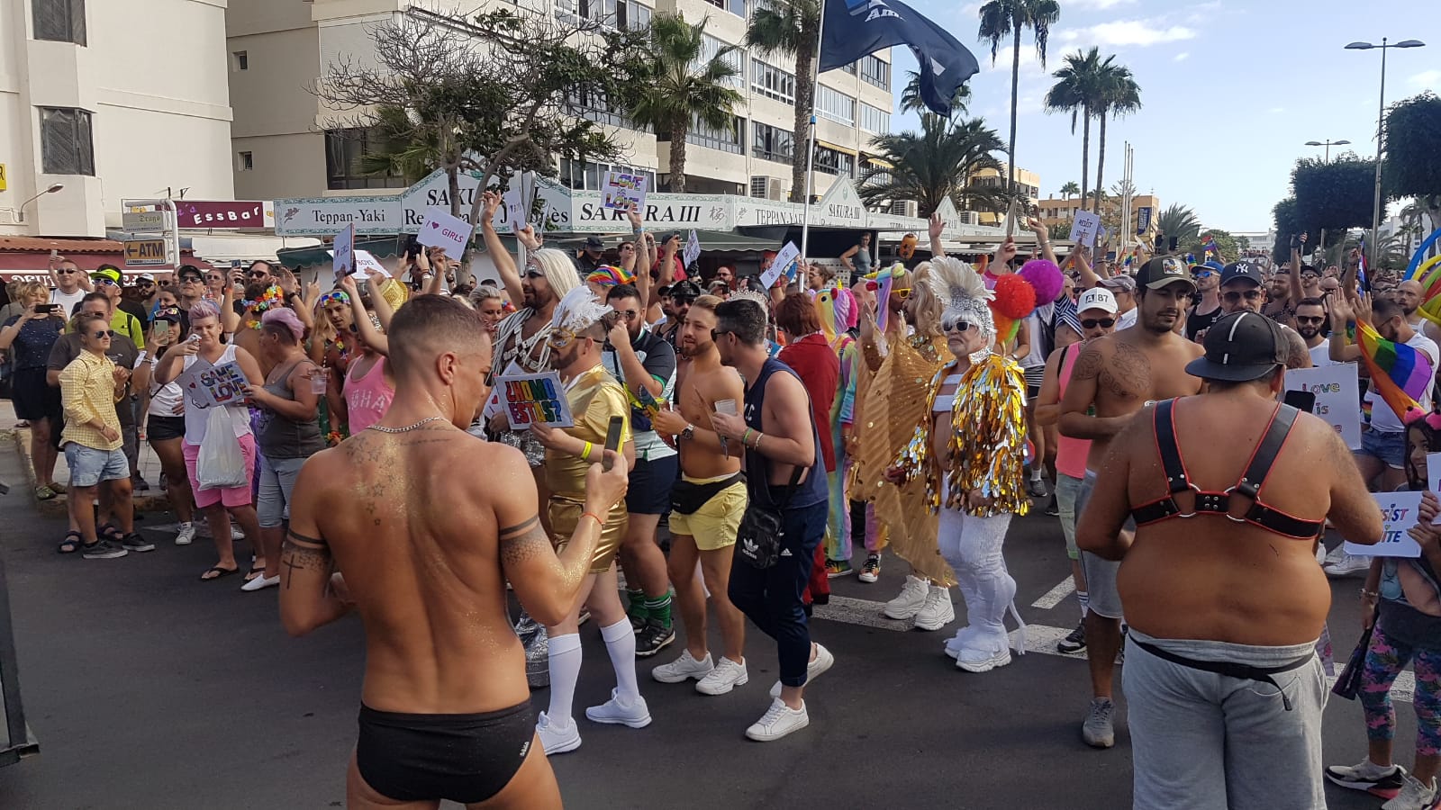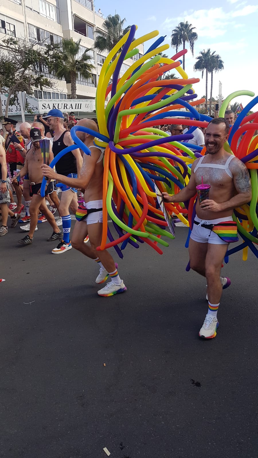 Nach unserer Runde durch die Cita und einem kleinen Snack fanden wir uns nämlich mitten in der "Gay Winter Pride Maspalomas" wieder, die schon seit Jahren zweimal im Jahr stattfindet. Eine riesige Schar mehr oder weniger bekleideter Männer feierten mit Gleichgesinnten eine tolle Party zu wummernder Musik.