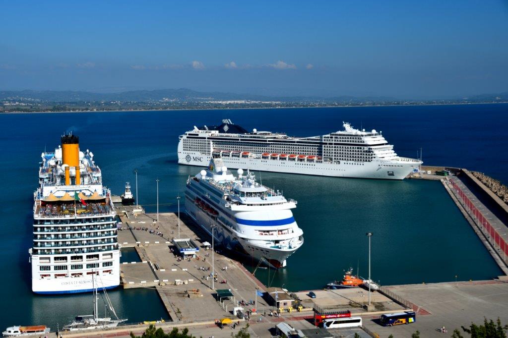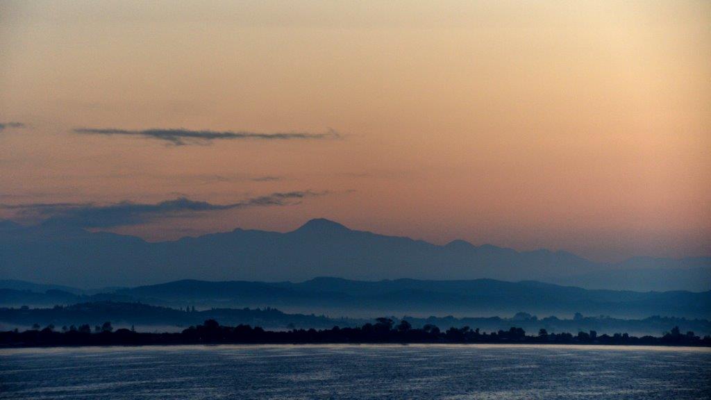 Ich war wach und machte mich nach dem Üblichen Richtung Rezeption auf, wo ich unsere Unzufriedenheit über die Lärmsituation mit der Bitte um „Änderung“ hinterließ. Der nächste Weg führte zum Kaffeespender. Heißer, starker Kaffee – er musste sein … Dann nach draußen. Es war frisch und noch immer nicht ganz hell. Der um das Hafengebiet ausgebreitete 300-Seelen-Ort Katakolon war gut zu erkennen. Wenig Action bis auf einige Ausflugsbusse, die die ersten früh aufgestandenen Ausflügler in die Umgebung transportieren sollten. Weiter weg vom Ort ein sich auf dem Festland im Dunst erstreckender Bergrücken.