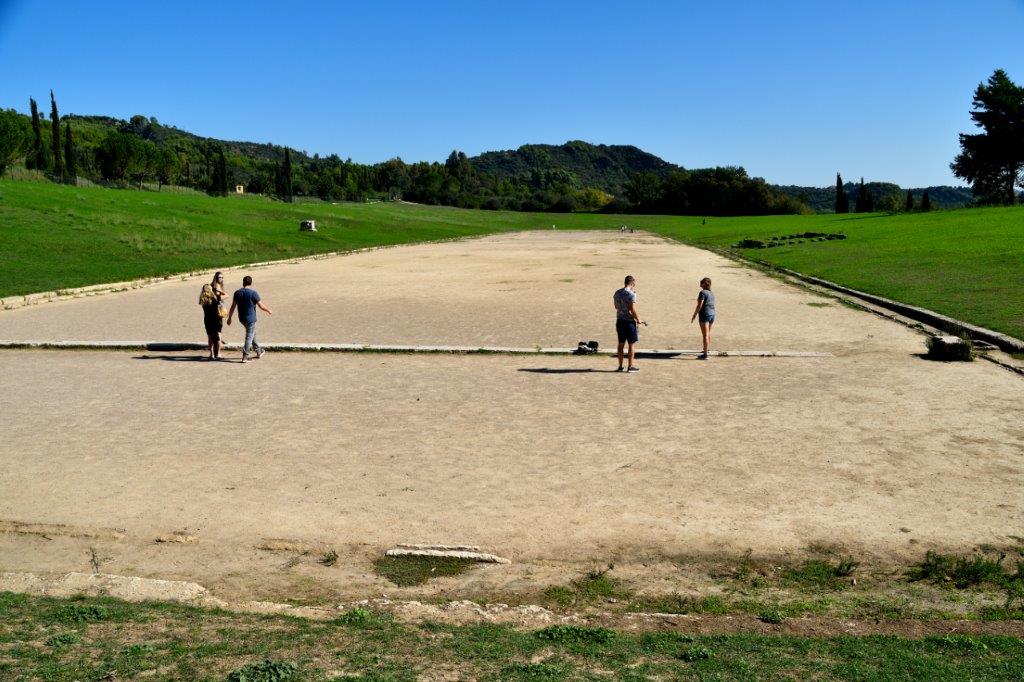 Aber was war denn das?! Nicht stilgerecht! Mit Schuhen und Freizeitkleidung. Das konnte nichts werden. Wie sollten sie ein Stadion im Sprint schaffen?! Nur zur Erinnerung: 1 Stadion = 600 antike Fuß = 192 m. Und logisch: Die Sportler schafften diese paar Meter nicht. Nach dem Start bremsten sie unvermittelt ab. Fehlstart! Und Disqualifikation. Schon hatte ich keine Gegner mehr. Und trat nicht an. Denn so wie Nero wollte ich nicht gewinnen … Ach ja – bereits damals war dieses Olympiastadion bundeligareif. Bis zu 40.000 Zuschauer konnten von den Erhöhungen um die Sportstätte die Sportler anfeuern. Natürlich gab es auch eine VIP-Tribüne: Reste sind auf dem Foto rechts zu sehen. Dort hielten sich die natürlich unbestechlichen Schiedsrichter, Prominente und Beamte (warum die???) auf.