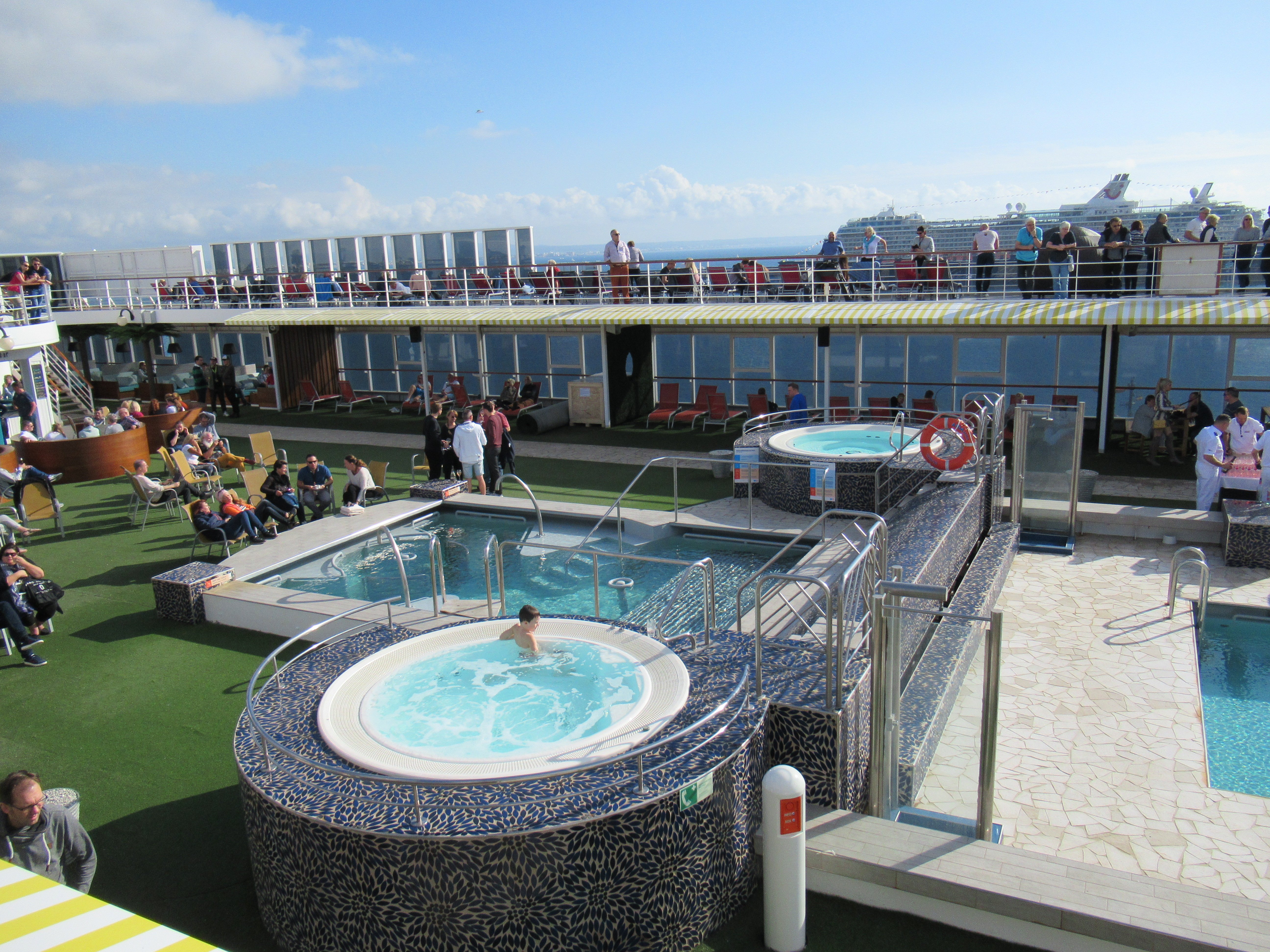 Die Pflichtveranstaltung rief und dauerte. Kein Wunder, nix mit Bordkarte, sondern die gute alte Handarbeit. Dann war auch das geschafft. Rettungsweste in die Kabine und rauf auf's Pooldeck.