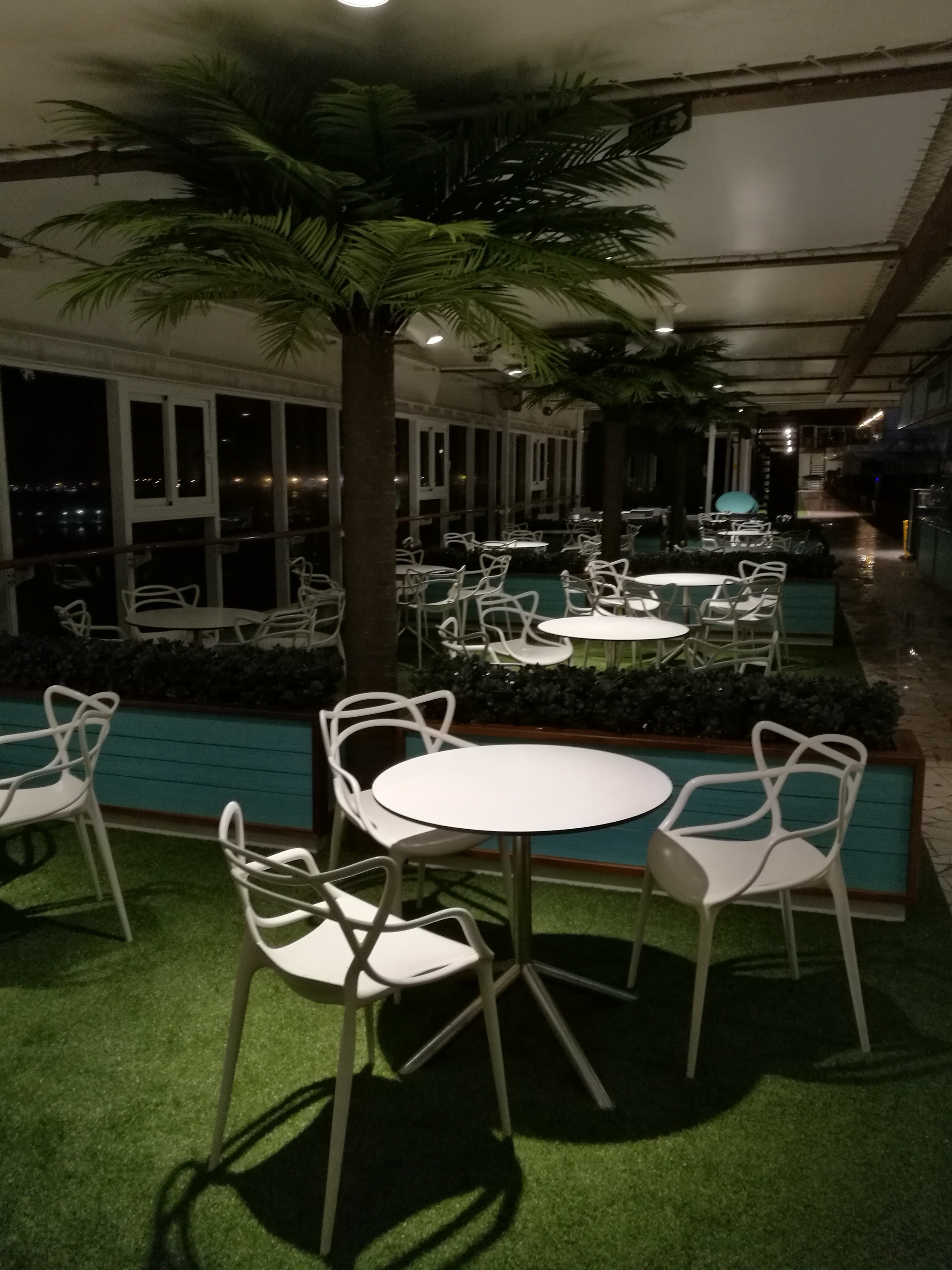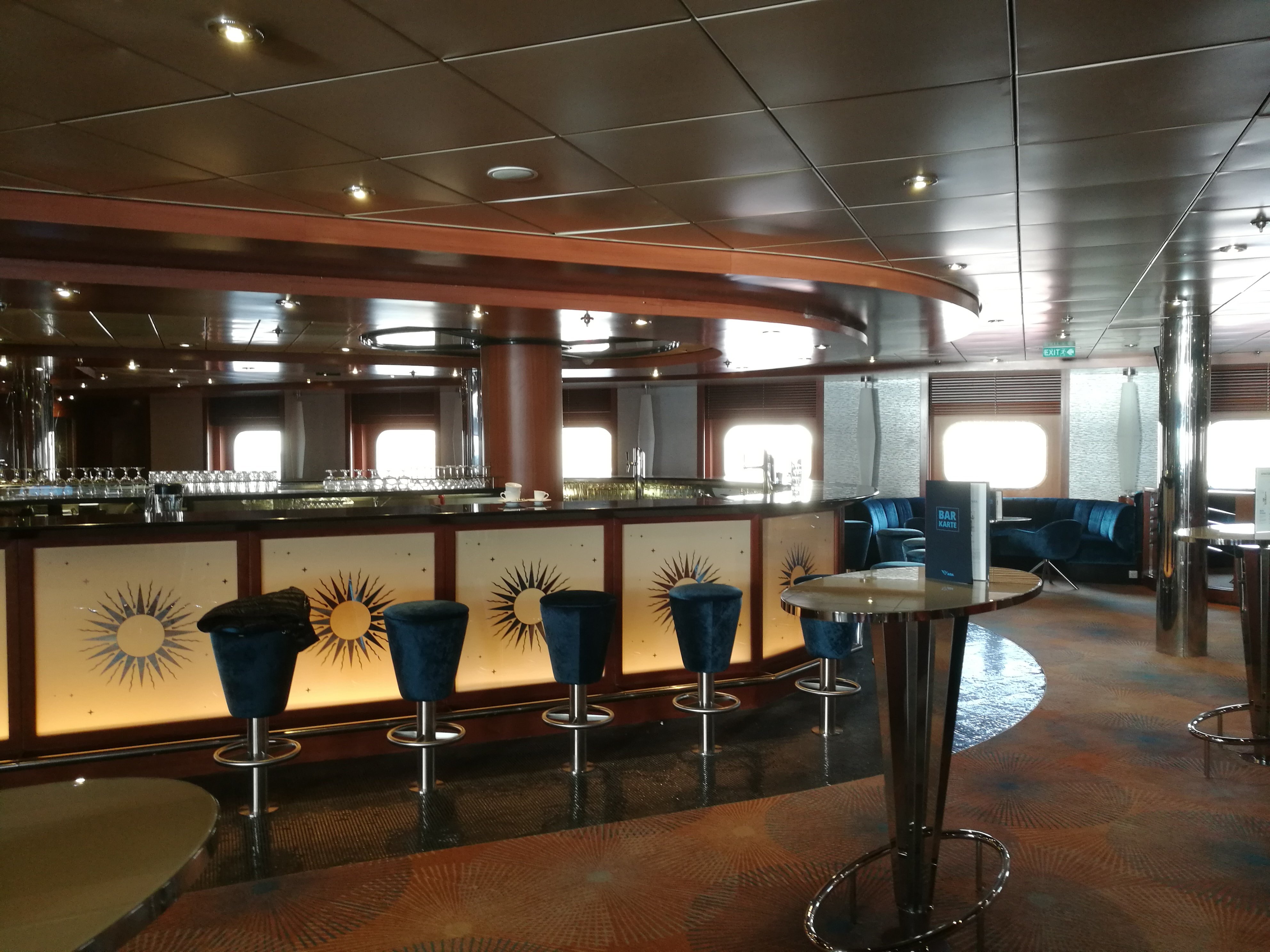Wer jetzt eine Sternenbar erwartet wird enttäuscht. Die Bar heißt zwar AIDA Bar, ist auch groß, hat eine Bühne und es finden dort Veranstaltungen statt, an AIDA erinnert aber nicht mehr viel. D.h. doch, die ovalen Stehtische.