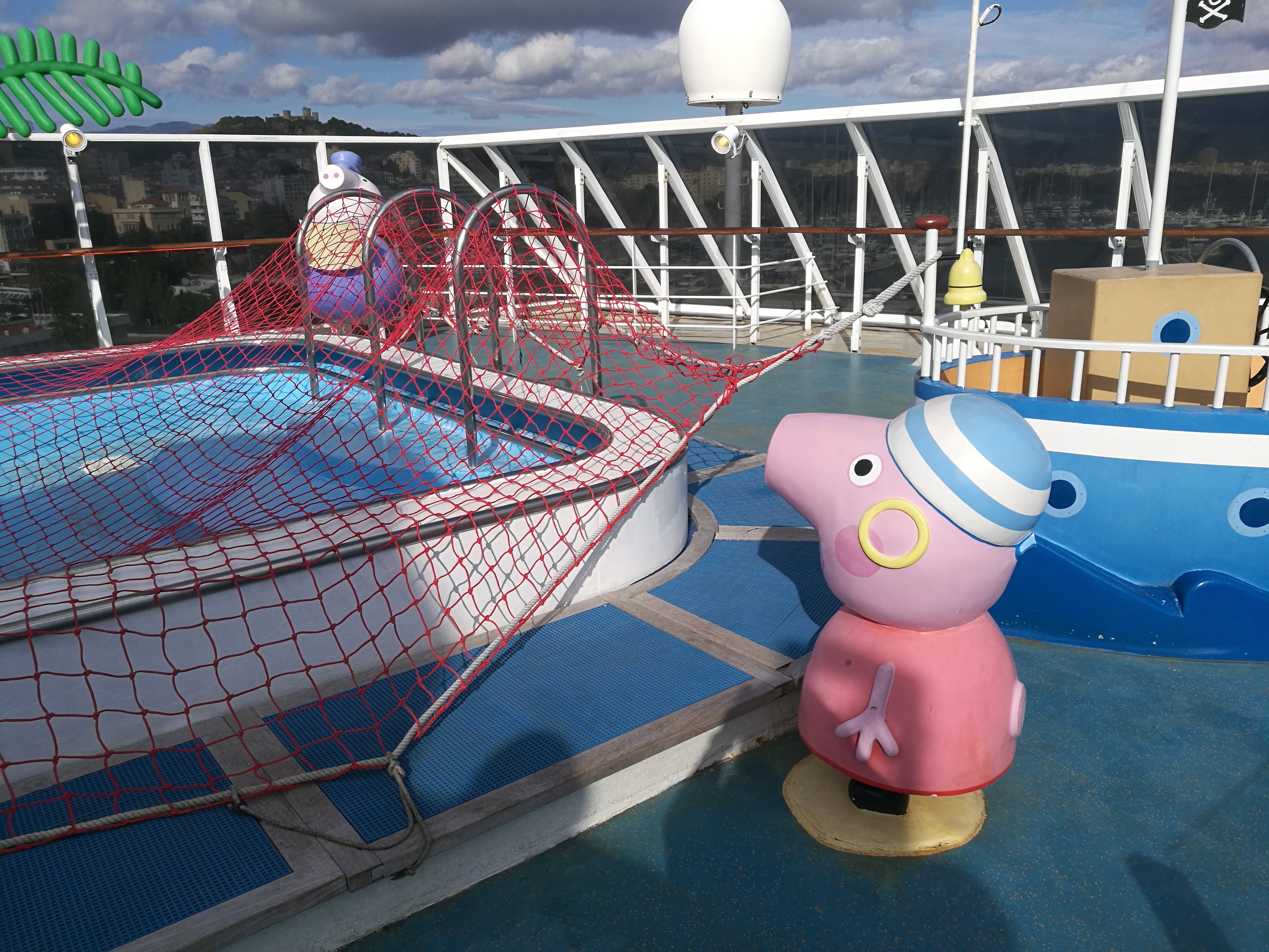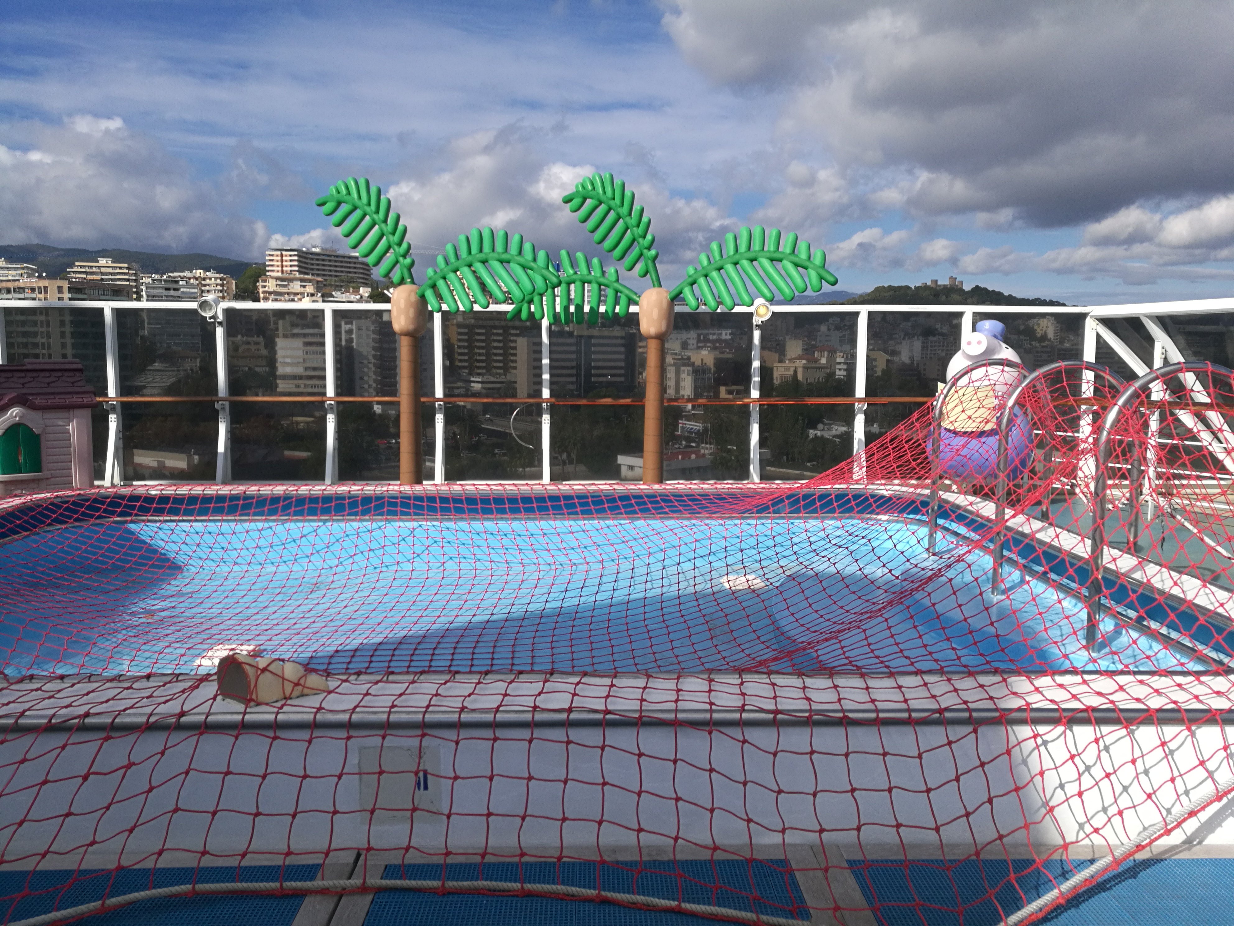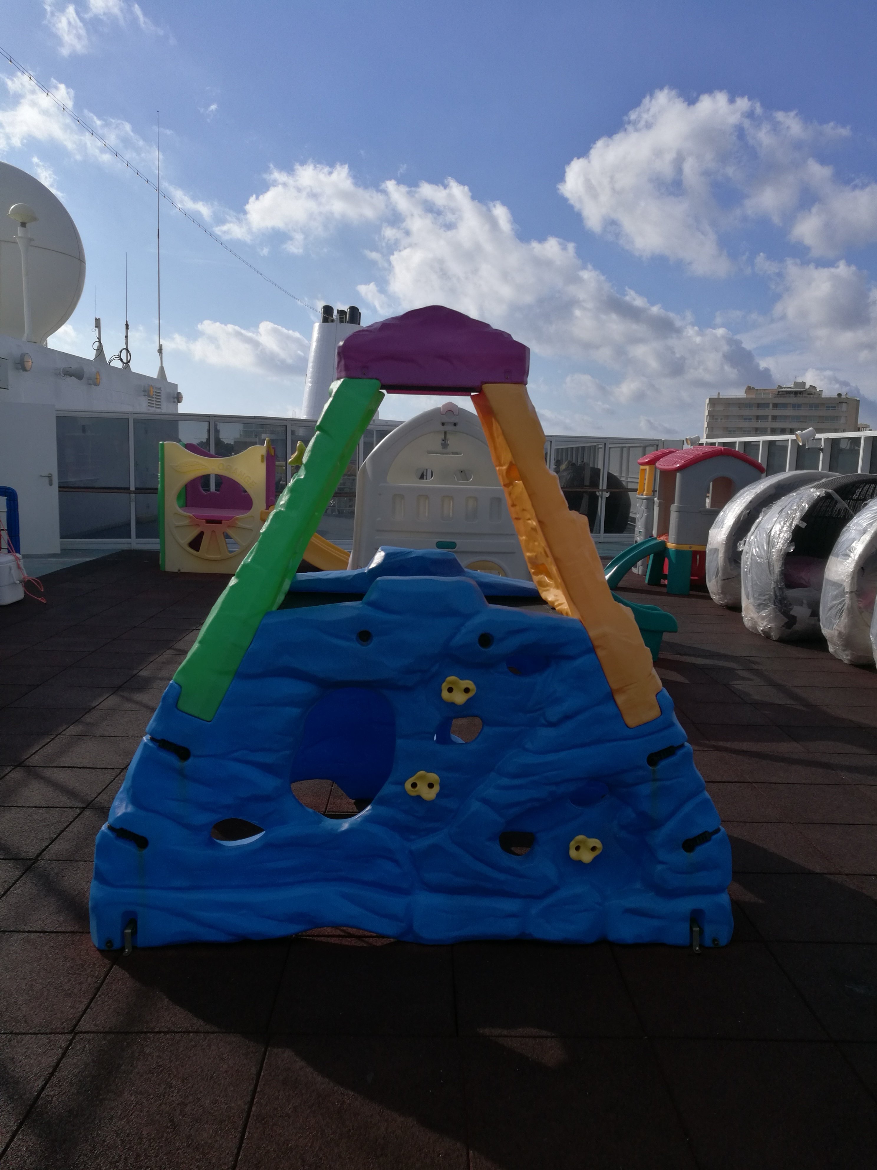 Da standen wir nun alle. Ich habe zwar die Aussicht und die Sonne genossen, aber nach fast einer halben Stunden wurde mir langweilig. Die Gangway war noch draußen. Es tat sich nichts. Das war die Gelegenheit, mir den Außenbereich des Kidsclub anzusehen. Dieser befindet sich nur wenige Schritte entfernt ebenfalls auf Deck 12.