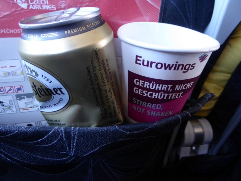 Aber, jetzt kommt es; der Flugkapitän meldet sich, wir sollen uns bitte alle setzen und anschnallen. Plötzlich ruckelt es ordentlich und ganz ehrlich, nach meinen vielen Flügen hatte ich doch etwas feuchte Hände und mein Mann schaute mich fragend an. „Nein, wir sind nicht auf der Buckelpiste unterwegs!“, flüsterte er mir zu. Er kennt meine Flugangst und beruhigte mich, so gut es ging. Ich konnte noch nicht mal mit einem alkoholischen Getränk in Form einer Dose Bier meine Nerven beruhigen. Trinken? Na ja, bei dem Gehoppse der Maschine war es schon eine Kunst, etwas in einen Becher einzuschenken und die Dose wollte ich nicht an den Mund führen. Wer weiß, ob der Schneidezahn heile bleibt. Die Aufschrift des Pappbechers ist vielsagend ...