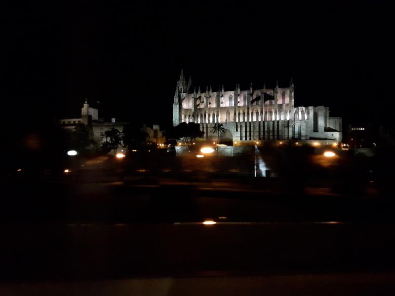 Egal, Luft holen, langsam ausatmen und irgendwann hat sich die Lage stabilisiert und dann hieß es schon, bereit machen zu Landung. Also das Gepäck kam echt schnell angerauscht und eh wir uns versahen, saßen wir im Bus in Richtung Porto Pi, wo unsere Sol auf uns wartete. Es ist mal was besonders, abends anzukommen. Der Blick auf die Kathedrale war schon beeindruckend.