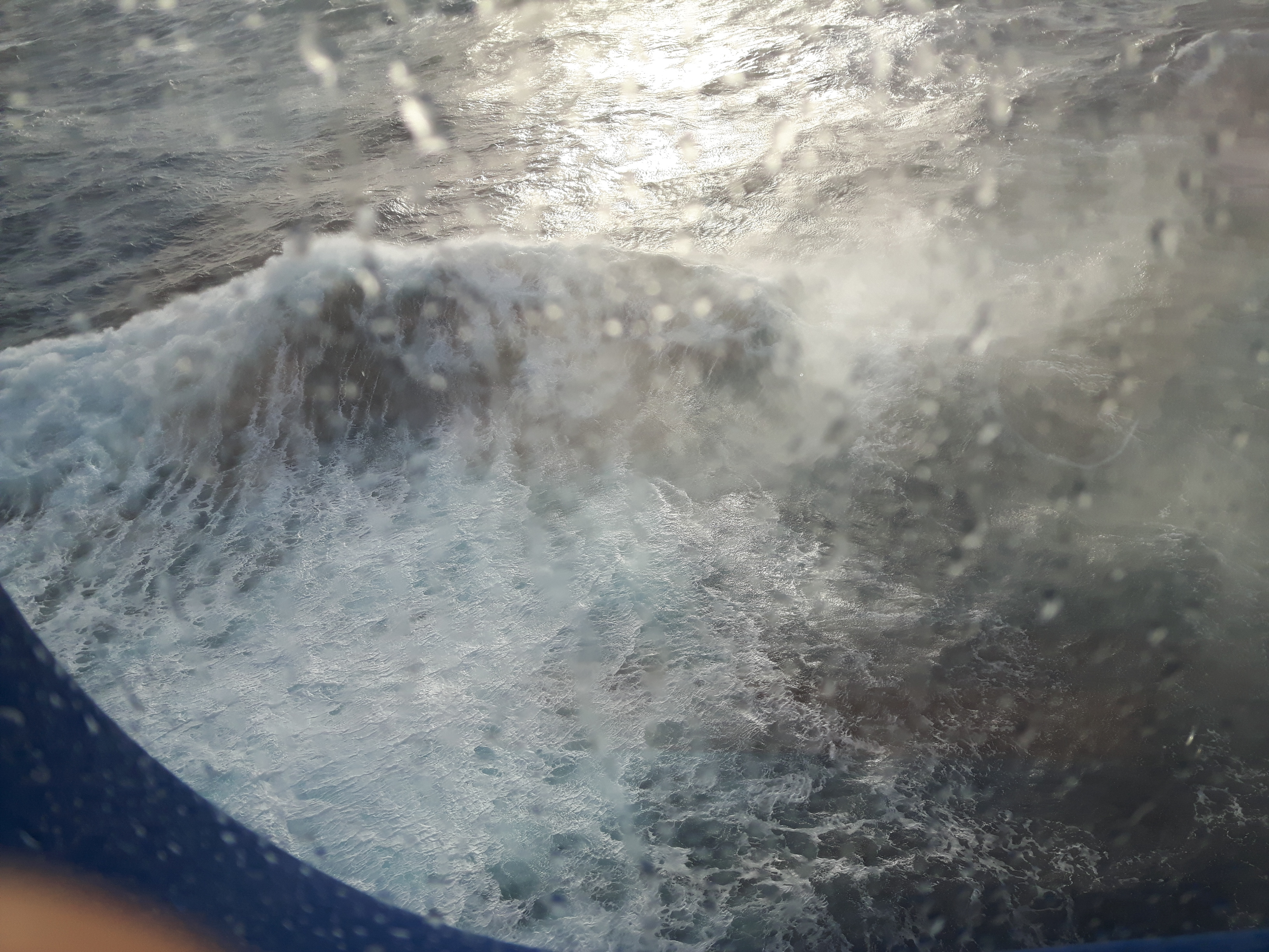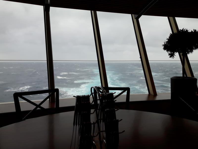 Zur Stärkung bestelle ich mir was ordentliches zum Frühstück, kleines Steak mit Pilzen und Zwiebeln, dazu ein ganzes Brötchen und für den Kreislauf einen Americano, bitter und starker Kaffee. So, jetzt ist alles gut. Wir schauen aus durch die bespritzte Scheibe nach draußen. Wellenberge kommen vom Bug her und die Gischt schäumt wild. Da ist es schon sehr vernünftig, dass die Außenbereiche abgesperrt sind.