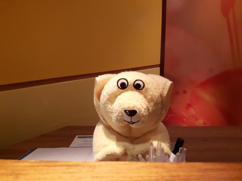 Die Tische sind eingedeckt für einen kleinen Imbiss. Am Eingang werden wir mit Sekt oder Bierchen empfangen und natürlich darf das obligatorische Foto nicht fehlen. Ich mag diese Treffen, denn erstens lernt man andere Mitfahrer kennen und wir treffen oft Crewmitglieder, mit denen wir schon mal unterwegs waren. In diesem Fall ist es der Restaurantleiter des Brauhauses, den wir schon längere Zeit kennen und dann ist der liebenswerte F&B Manager dabei. Ein Hallo und freudige Umarmung, ja, wir waren vor zusammen unter anderem an Bord in Indien unterwegs gewesen. Das nenne ich doch einen Zufall.