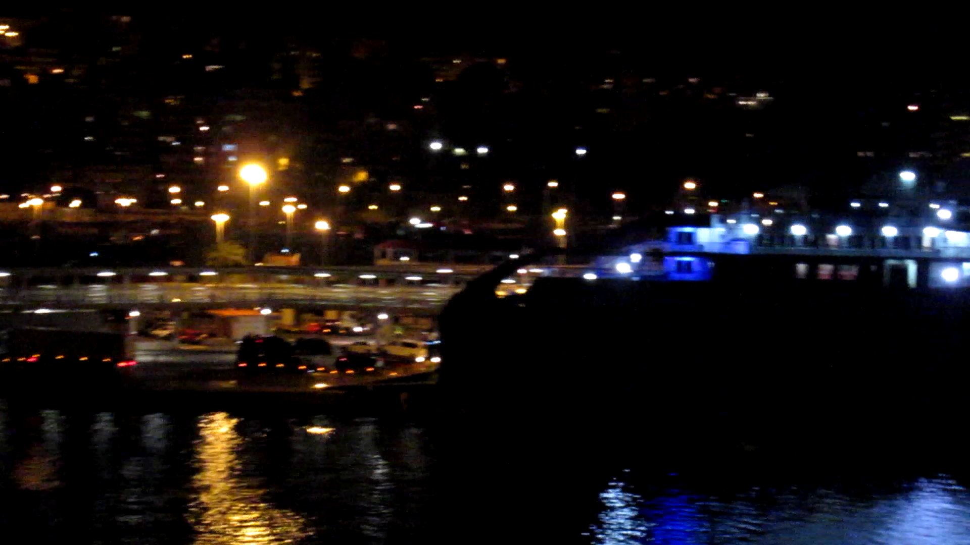 Ein Highlight erwartete uns noch an diesem Abend: Das Auslaufen. Es war kalt geworden und extrem windig. So wunderte es mich nicht, dass wir einen Schlepper zur Assistenz hatten. Mit Verspätung ging es dann los. Vom darunterliegenden Deck drang ein leises Sail Away zu mir hoch. Nicht die Version von Anya, sondern die eines Chores. Über die Kopfhörer der Silent-Party wurde auf Wunsch der Gäste dieser Auslaufsong gespielt. Und alle die einen Kopfhörer hatten sangen oder summten mit. Es war wieder ein Wechselbad der Gefühle. Hurra, wir fahren! Schade, schon vorbei! Jedenfalls bewegten wir uns aus eigener Kraft von einer Pier zu anderen und sendeten dem Heizer noch einen kräftigen Gruß.