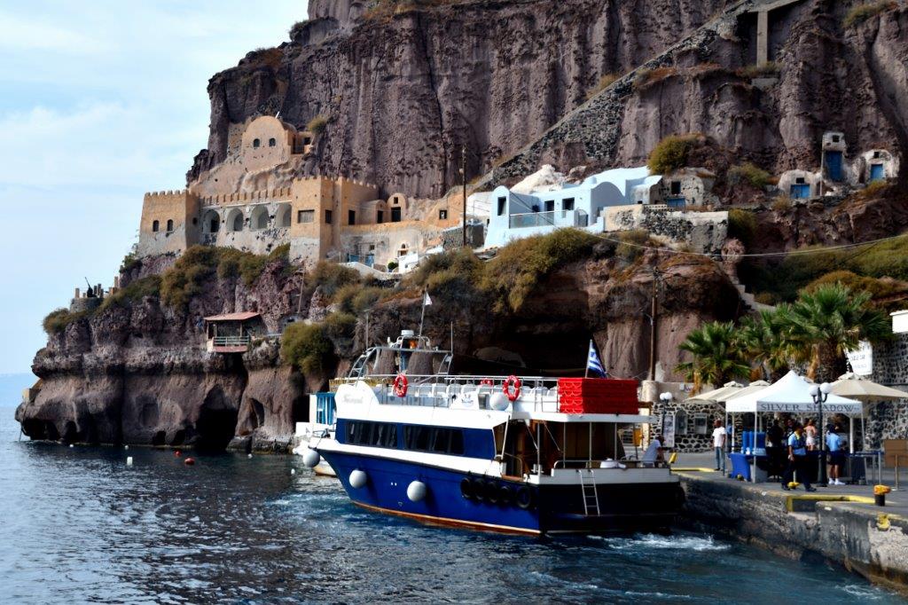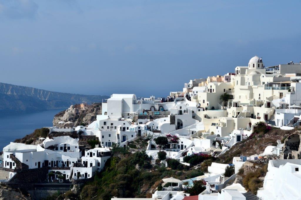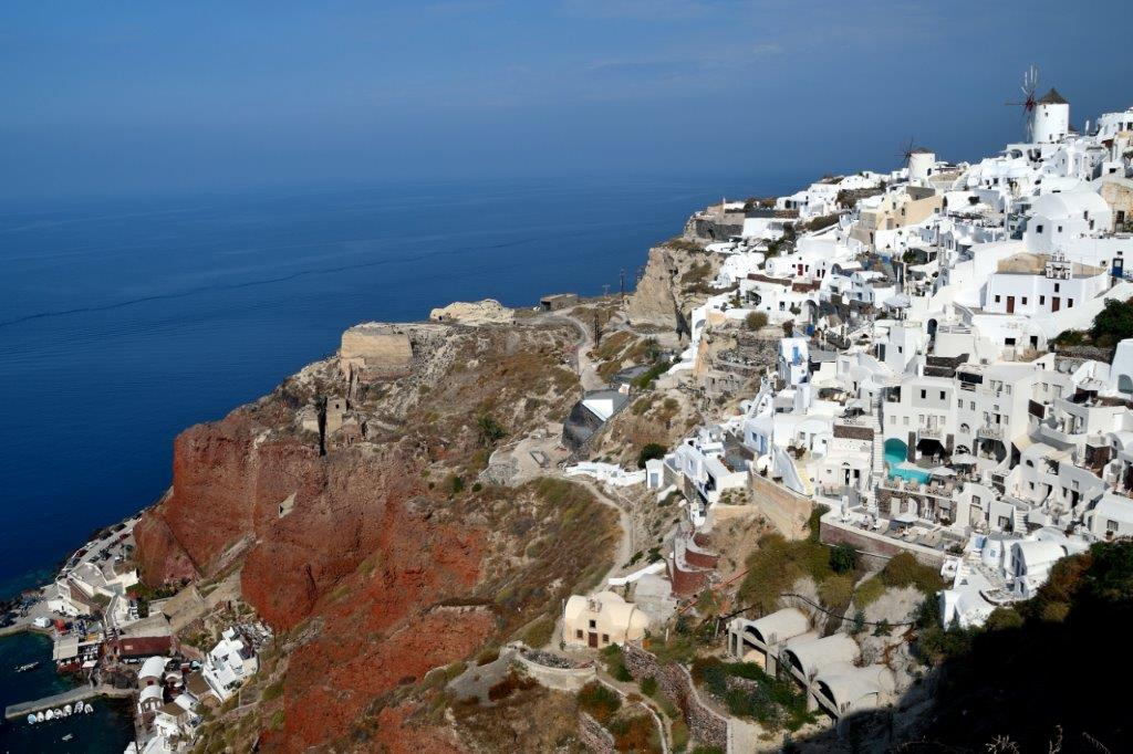 Vor dort aus gab es einen fast Rundumblick auf die attraktivsten Ortsteile und den Hafen von Oía.