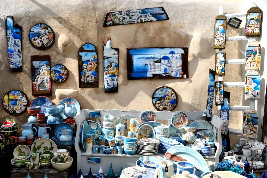 Für Santorini typische Urlaubsandenken – wir fotografierten nur und dachten dabei ganz prosaisch an die Gewichtsbeschränkungen bei den Flügen …