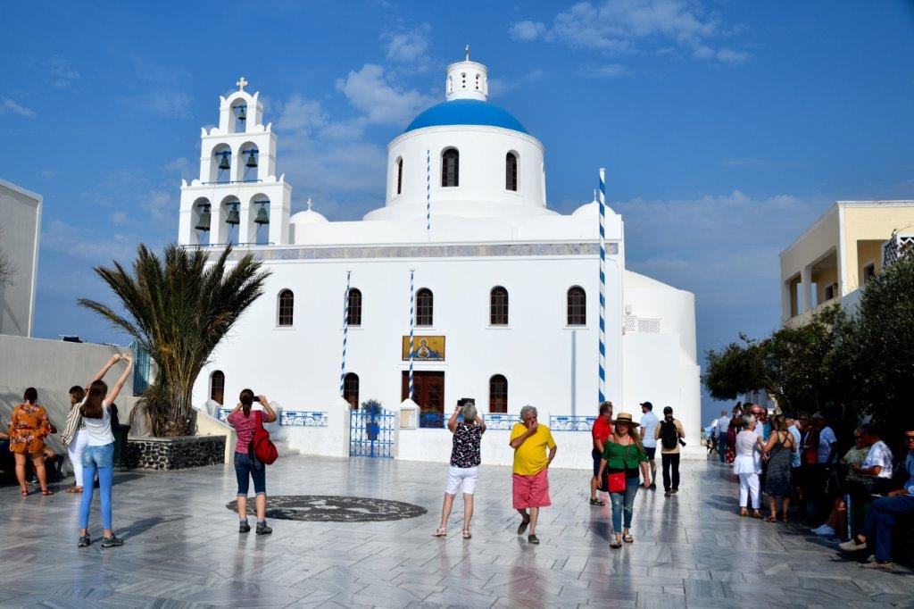 Wir erreichten Oía und unser Fahrer steuerte sofort den am Ortsrand liegenden Parkplatz an. Oh Gott – war der proppenvoll. Ein Bus neben dem anderen. Ob es in den Gassen wieder so voll werden sollte wie vor einem Jahr? Wie üblich: abwarten … Wir stiegen aus und wurden von unserer Reiseleiterin im Gänsemarsch durch die schmalen Gassen zum glänzenden Hauptplatz mit der Kathedrale Panagia Platsani geführt.
