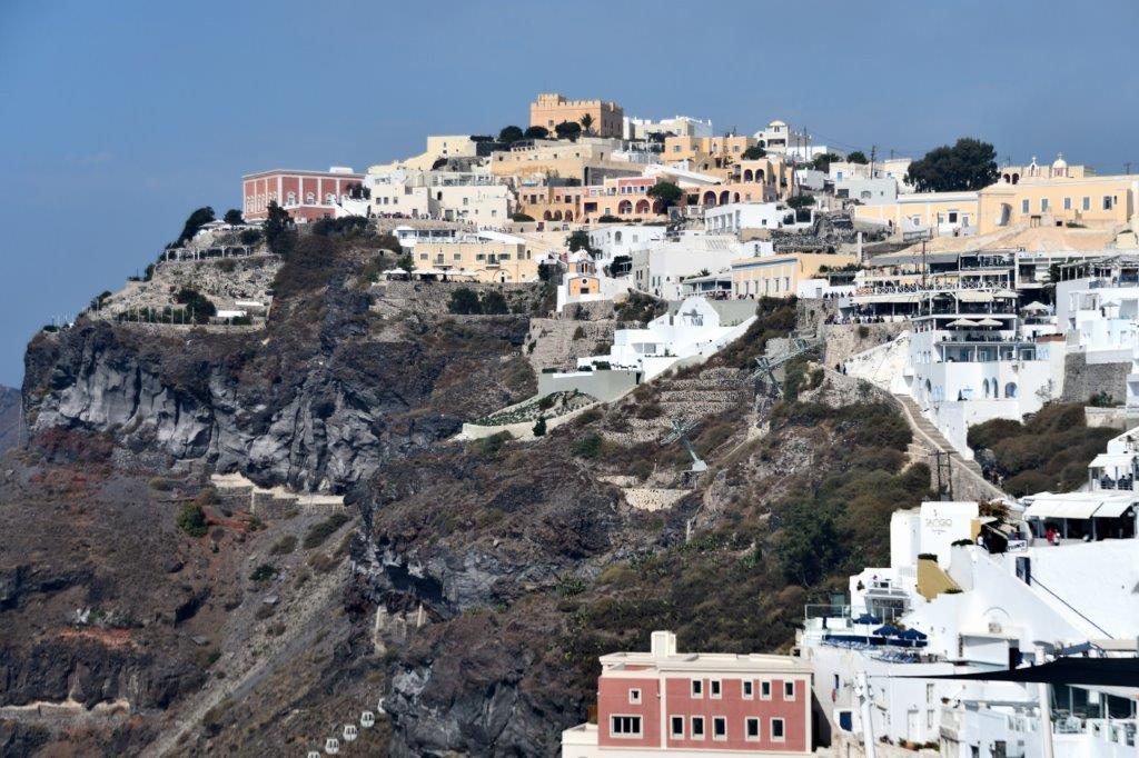 aber nicht so geballt wie am Vormittag. Das änderte sich ein wenig, nachdem wir die römisch-katholische Kathedrale Johannes der Täufer besucht hatten und Richtung Oberstadt schlichen. Jawohl schlichen! Denn es war sehr, sehr warm und die von uns durchstreiften Gassen kennzeichneten sich durch ein ewiges Auf und Ab auf nicht immer ebenen Wegen. Doch das gehörte zu den sich auf Santorini an den Abhängen krallenden Orten. Da kam man eben nicht vorbei. Auch wir nicht – und wir bereuten es erneut nicht. Allein wegen der Ausblicke am Abhang. Z.B. der Blick zurück auf den Ortsmittelpunkt.