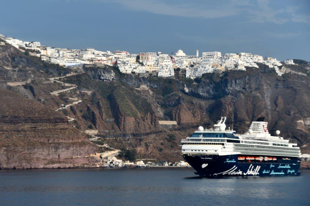 So früh auf den Beinen? Im Urlaub? Vom Getöse und Vibrieren des Schiffes geweckt? Nein – die Nacht und der frühe Morgen waren recht ruhig. Trotzdem mussten wir früh raus, denn nach einem schnellen Frühstück fanden wir uns um 8.20 Uhr im Theater ein zum Ausflugstreffen „Oía und Thira“. Nach einem zähen Ablauf wurde getendert. Vorbei an Mein Schiff Herz, Silver Shadow und Celestyal Chrystal wurden wir an Land gebracht, wo uns der Ausflugsbus aufnahm. Und es ging sofort los. Eine sich hoch schraubende Serpentine nach der anderen. Auf der einen Seite zunächst meist rotbrauner Vulkanfelsen; auf der anderen Seite der Abgrund. Nach jeder Kurve natürlich umgekehrt … Es wurde prickelnd, als unser Bus vor einer Kurve aufgrund eines entgegenkommenden Busses zurücksetzen musste. Viel fehlte nicht – aber ich kann noch schreiben … grins … Unser Busfahrer meisterte diese Situation mit Ruhe und Bravour. Einigen in dem Bus fehlten in diesen Minuten mit Sicherheit die Ruhe unseres Fahrers … Entschädigt wurden sie und alle anderen mit unbeschreiblichen Ausblicken auf den neuen Hafen von Thira, die Caldera und die Schiffe, auch wenn es noch recht diesig war. Nach der Bewältigung des steilen Anstiegs kam für unseren Busfahrer die nächste Bewährungsprobe: Er musste den Bus durch die teils sehr engen Gassen Thiras wursteln … Hatte der Nerven … und er behielt sie. Die Weiterfahrt genossen wir mit Ausblicken auf die Caldera und die Landschaft. Bei Letzterer so gut wie keine Bäume und wenig Sträucher. Rotbraun und schwarz überwog. Ab und zu unterbrochen von sich auf dem Boden duckenden abgeernteten Weinreben. Mehr Trockenheit als sonst ´was. Aber wenn es einmal regnete, wurde das Leben spendende Nass vom zerbröselten Vulkangestein aufgefangen und gespeichert. Das nutzten die Bewohner aus und trieben den Anbau von Niedrigfrüchten wie Kirschtomaten, Kapern und Melonen voran. Aber davon sahen wir wenig – die Wachstums- und Erntephase waren schon Vergangenheit.