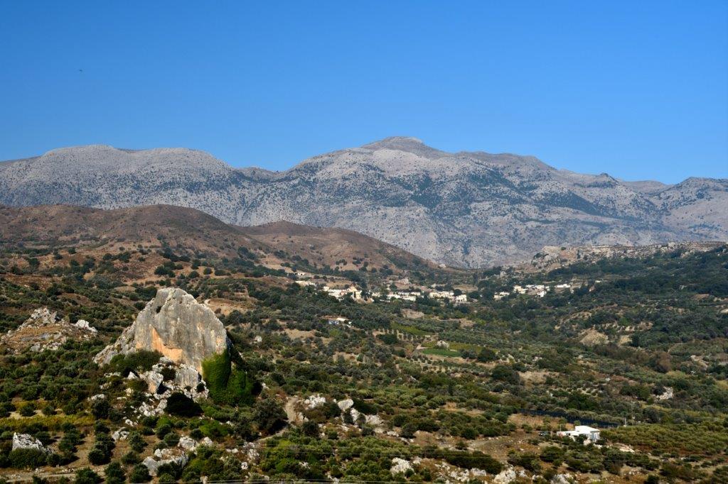 Wo sich einst ausgedehnte Wälder erstreckten, sahen wir bei einem Halt zwischen zwei Bergketten. In den unteren Regionen erkannten wir Olivenhaine. Je weiter wir nach oben blickten desto karger wurde es. Der mit 2.456 m höchste Berg Kretas im Ida-Gebirge, der Psiloritis, lag ganz oben in den Wolken. Andere benachbarte Bergspitzen waren frei – und auch wieder karg.