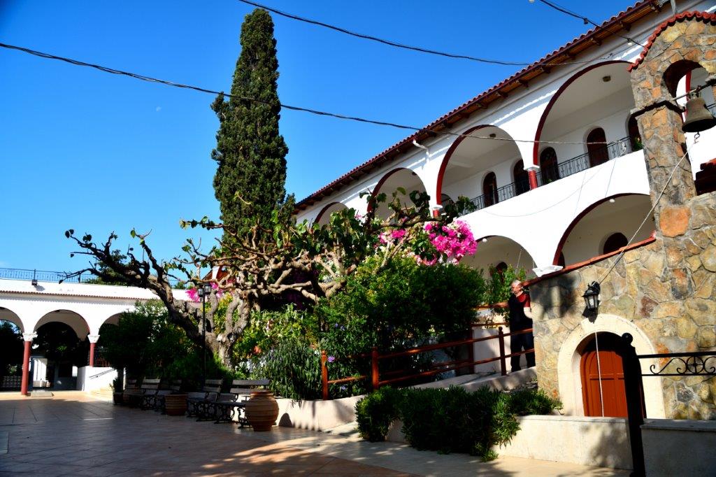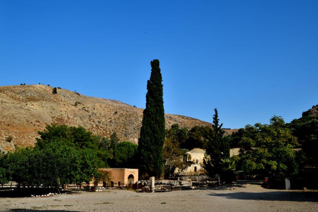 Von Gortyn steuerte Kerstin eine abseits von der Durchgangsstraße liegende Klosteranlage an. Es wäre unpassend zu schreiben: Hier, im Kloster Kalyviani, war der Teufel los. Aber Kerstin hatte bei ihren bisherigen Besuchen nie so viele Autos und Menschen auf der gesamten Anlage gesehen! Sie fragte uns Entgegenkommende, was los war. Die Antworten: Ende des Gottesdienstes und so etwas wie ein in der katholischen Kirche übliches Jahresgedächtnis. Menschenmassen – wieder ein Zeichen der großen Religiösität der Griechen. Und ein Kirchenbesuch gehörte in dieser Gegend zum Sonntag.