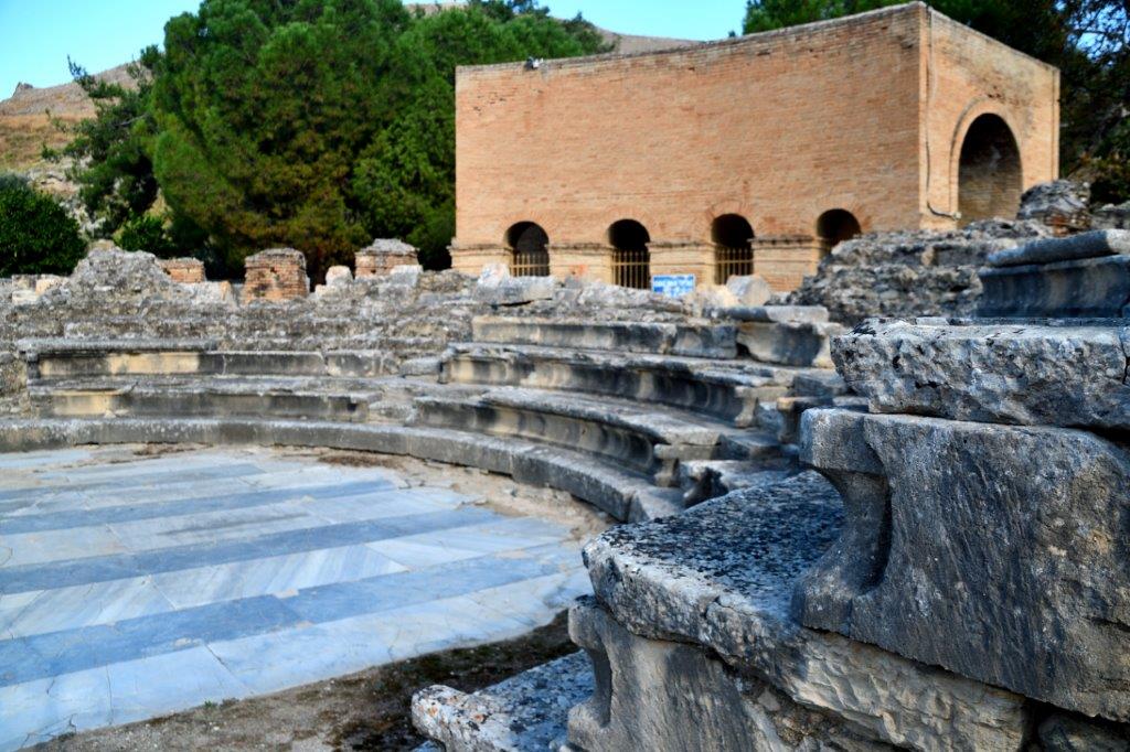 Hinter dem Bühnenraum befand sich ein wieder hergestellter Backsteinrundgang, in dem damals die Römer die Gesetzesplatten von Gortyn als Zierde untergebracht hatten.